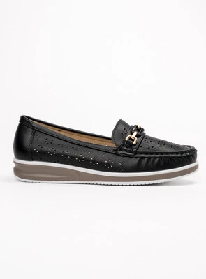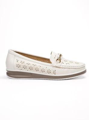 Damskie Mokasyny LENA WHITE to połączenie klasycznego fasonu z delikatnymi, ażurowymi wycięciami, które dodają lekkości i zapewniają doskonałą wentylację. Złota ozdoba na podbiciu nadaje im eleganckiego charakteru, świetnie komponując się z jasną cholewką. Dzięki podwyższonej podeszwie i wsuwanemu fasonowi mokasyny są nie tylko wygodne, ale też łatwe w zakładaniu – idealne na codzienne wyjścia i do bardziej casualowych stylizacji.