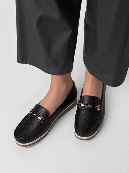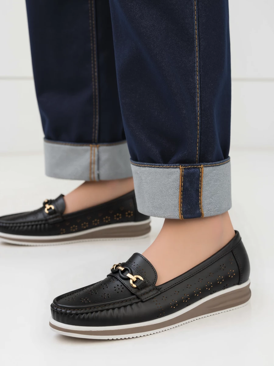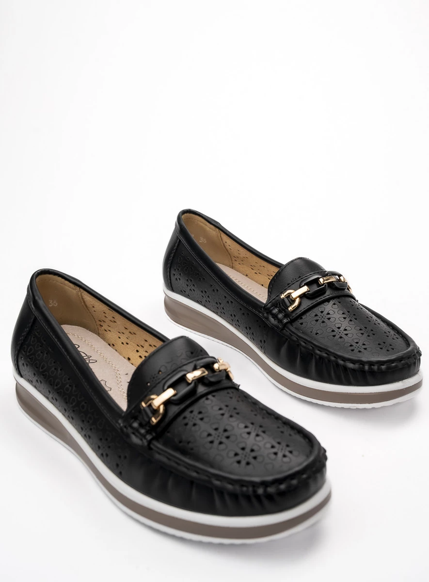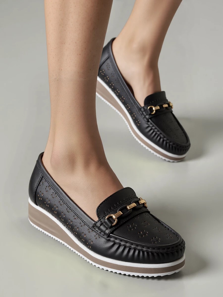 Damskie Mokasyny LENA BLACK to połączenie klasycznego fasonu z delikatnymi, ażurowymi wycięciami, które nadają butom lekkości i zapewniają przewiewność. Złota ozdoba na podbiciu dodaje im eleganckiego charakteru, doskonale komponując się z ciemną cholewką. Dzięki podwyższonej podeszwie i wsuwanemu fasonowi mokasyny są nie tylko wygodne, ale również łatwe w zakładaniu – idealne do codziennych, casualowych stylizacji.