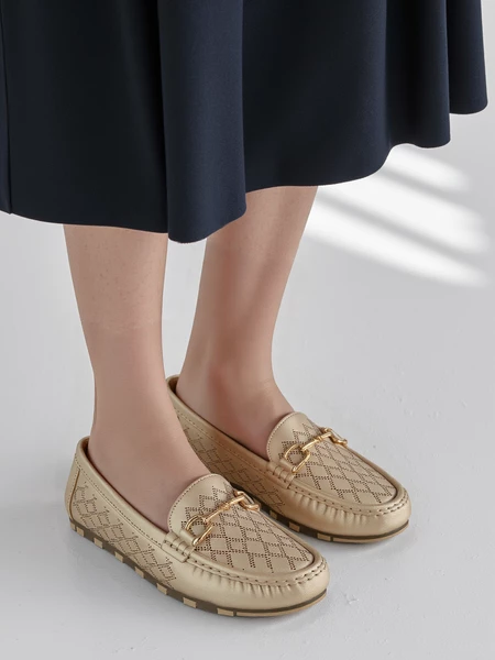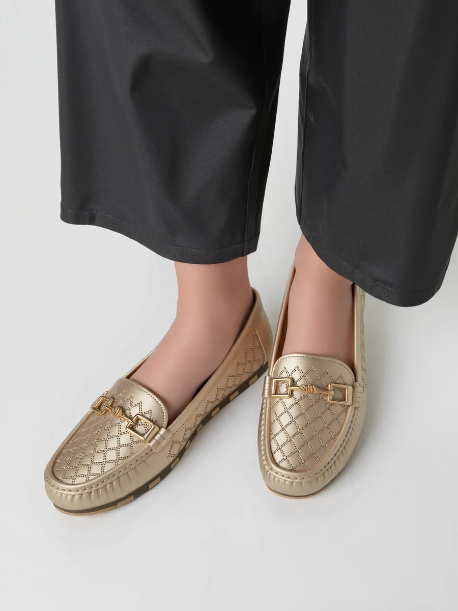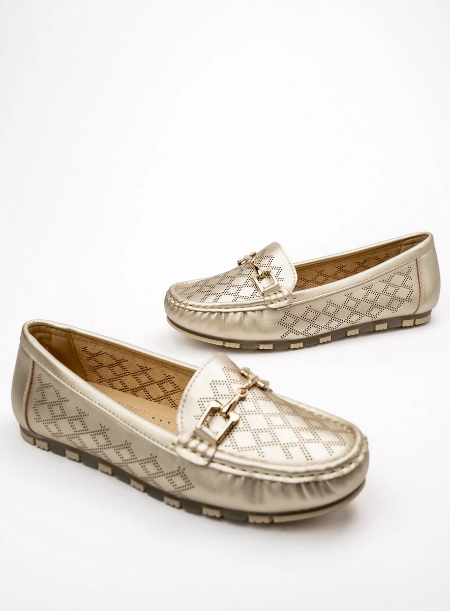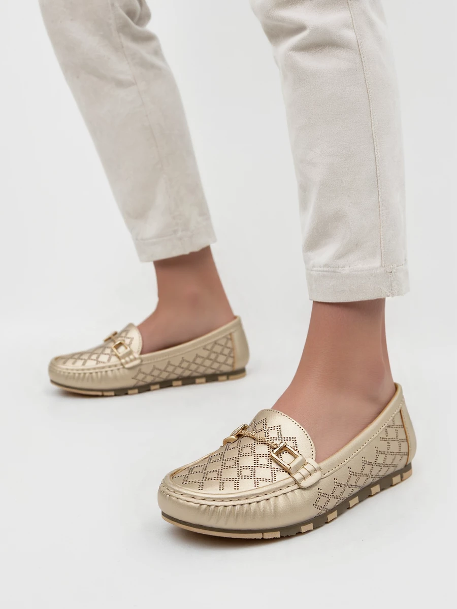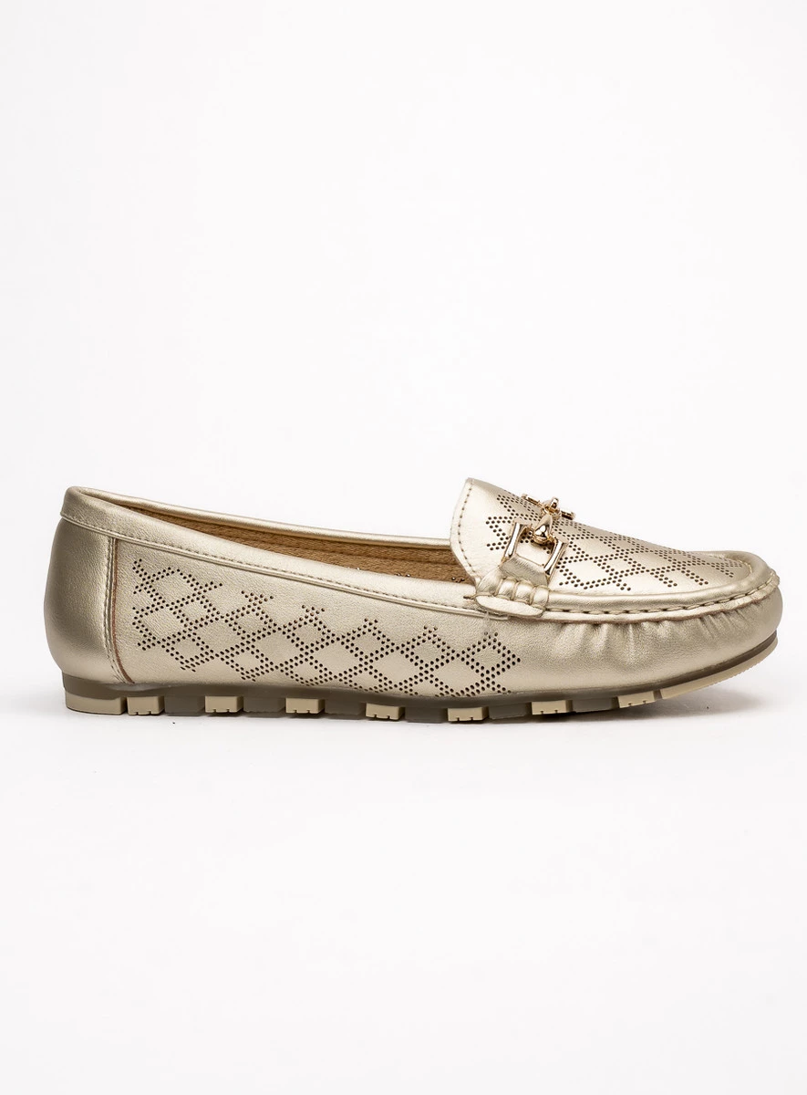 Damskie Mokasyny LIA GOLD to połączenie nowoczesnego designu z luksusowym akcentem. Cholewka wykonana z ekoskóry w intensywnym, złotym odcieniu, zdobiona ażurowym, geometrycznym wzorem, nadaje butom wyjątkowej lekkości i przewiewności. Delikatna ozdoba na podbiciu podkreśla ich szykowny charakter, a wsuwany fason oraz płaska podeszwa gwarantują komfort noszenia przez cały dzień.
