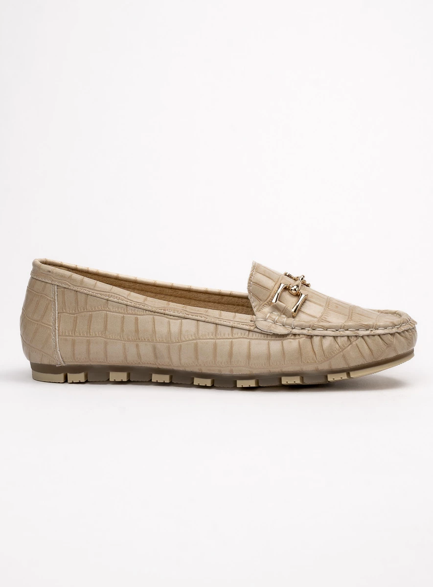 Damskie Mokasyny NICOL BEIGE to połączenie klasycznego fasonu z luksusowym wykończeniem. Wyróżniają się efektowną, tłoczoną cholewką w krokodyli wzór, która nadaje butom niepowtarzalnego charakteru. Subtelny, beżowy kolor oraz złota ozdoba na podbiciu podkreślają elegancki styl, jednocześnie pozostając uniwersalnym elementem garderoby. Dzięki wsuwanemu fasonowi i płaskiej podeszwie mokasyny zapewniają wygodę przez cały dzień, sprawdzając się zarówno w casualowych stylizacjach, jak i w nieco bardziej formalnych zestawach.