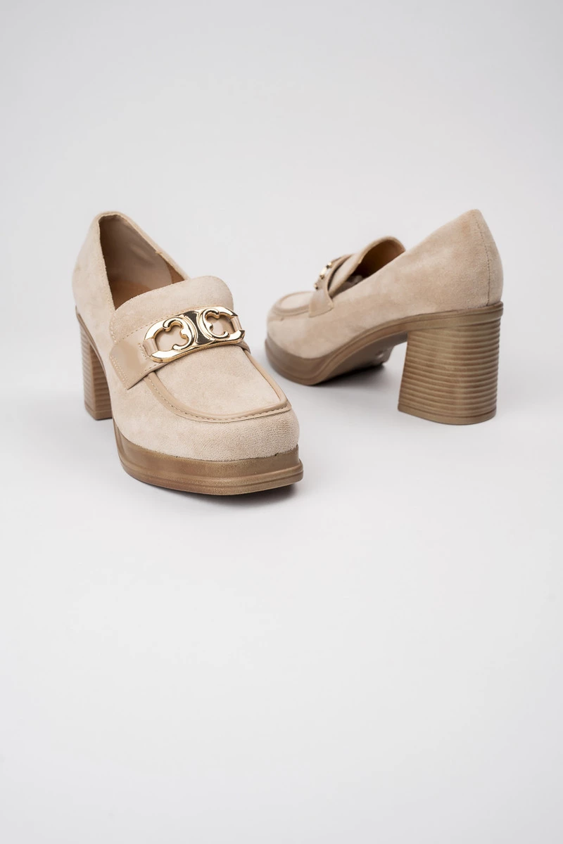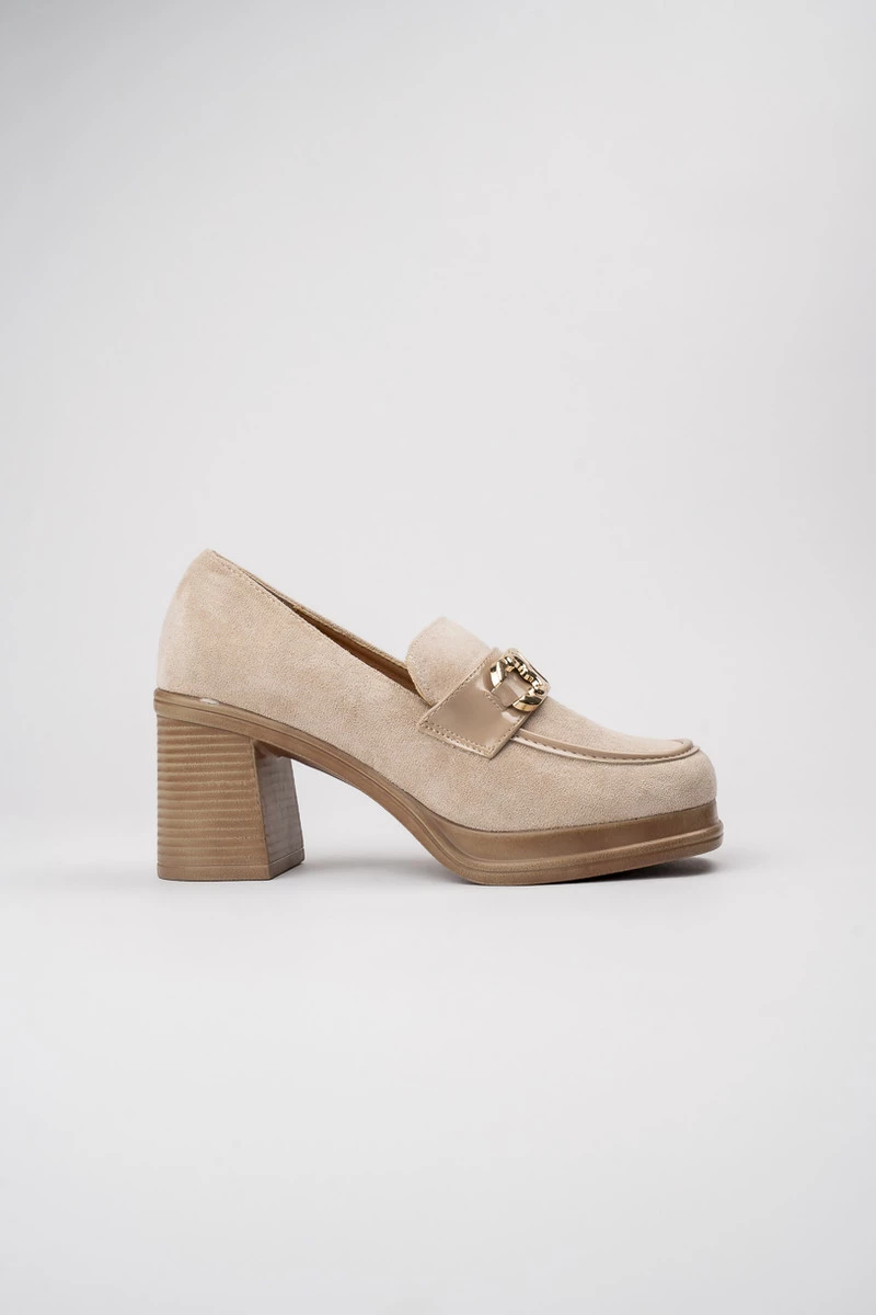 Damskie Loafersy LUX GRACE NUDE łączą w sobie delikatny, cielisty odcień z masywną platformą i złotym detalem, tworząc harmonijną mieszankę elegancji i wygody. Cholewka z ekologicznego zamszu w kolorze nude pięknie prezentuje się w zestawieniu z karmelową podeszwą i lakierowanym paskiem. To idealny wybór dla kobiet ceniących stonowane, ale efektowne akcenty.