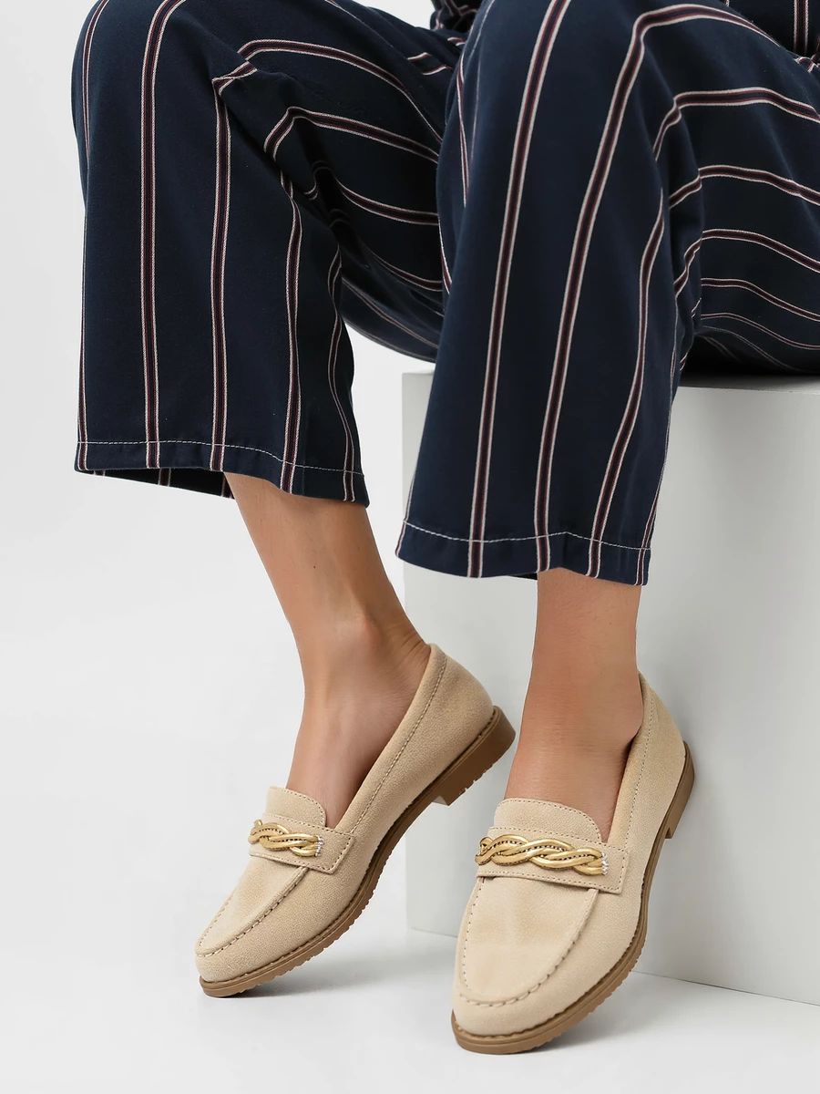Damskie loafersy ROCHE BEIGE to idealna propozycja dla kobiet ceniących sobie minimalizm i wygodę. Cholewka wykonana z ekologicznego zamszu w delikatnym beżowym odcieniu prezentuje się lekko i elegancko. Pleciona ozdoba z przodu dodaje modelowi charakteru, nie przytłaczając jego klasycznej formy. Wsuwana konstrukcja i płaska podeszwa zapewniają komfort przez cały dzień – idealne do pracy, na uczelnię czy codzienne wyjścia.