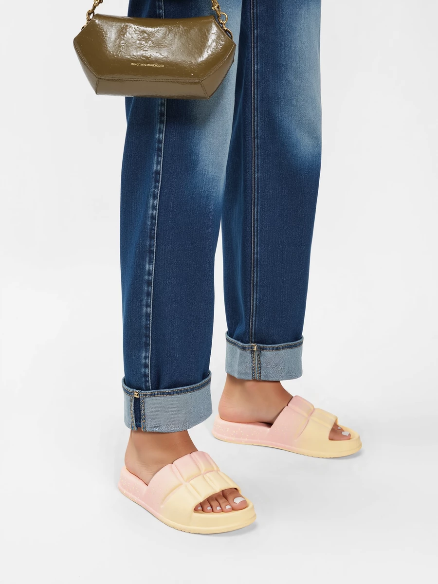 Klapki ESTRELLA w kolorze różowo-kremowym (PINK/CREAM) to eleganckie sandały, które łączą w sobie wygodę i modny wygląd. Wykonane z wysokiej jakości gumy, zapewniają komfort przez cały dzień. Ich wyjątkowy gradientowy design z efektem kropek na różowo-kremowym tle nadaje im oryginalności i sprawia, że klapki te wyróżniają się subtelnym, letnim stylem.