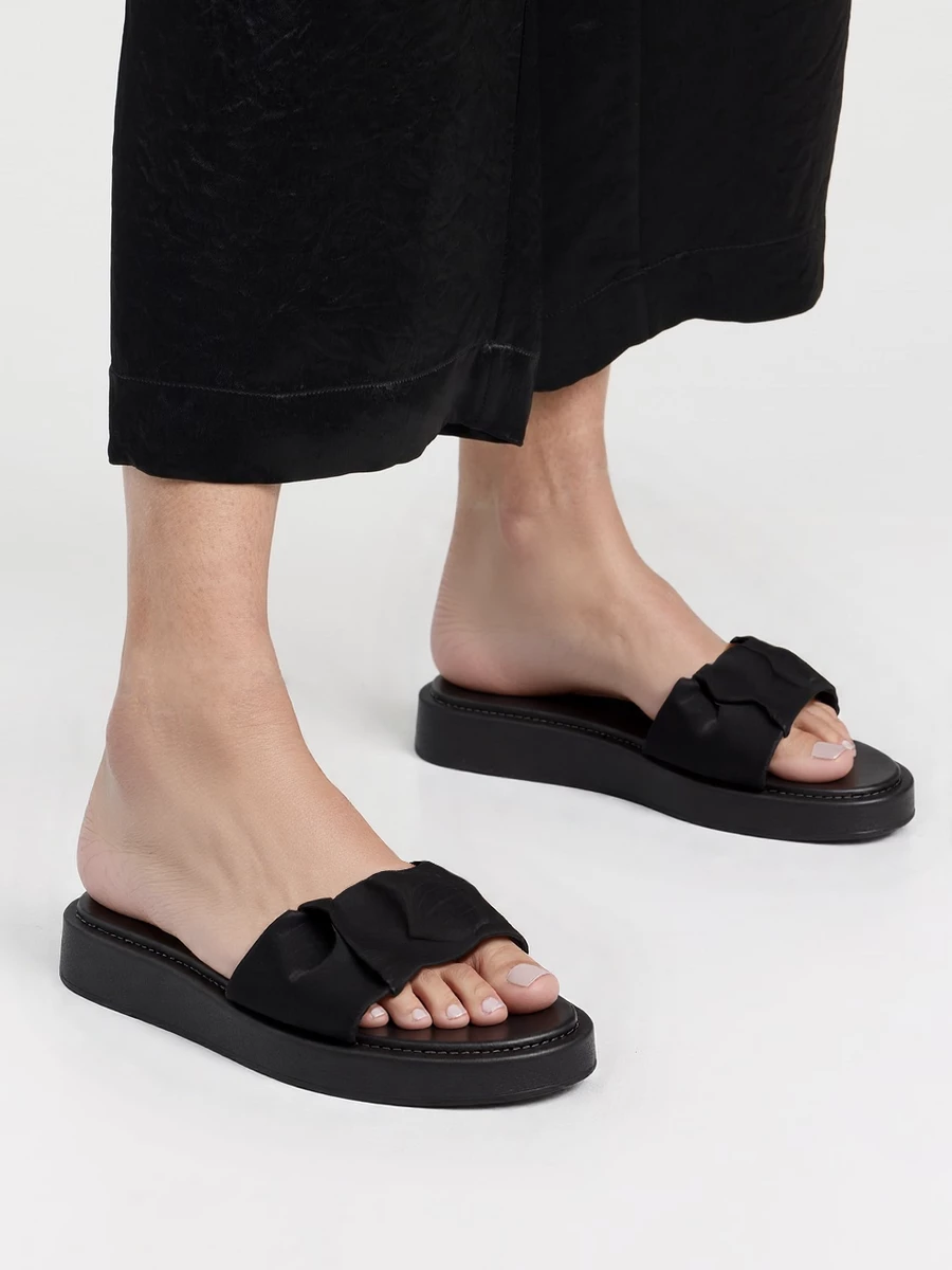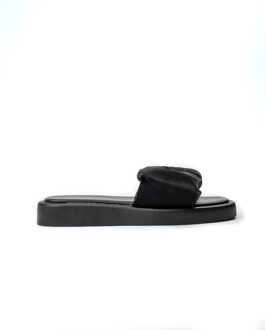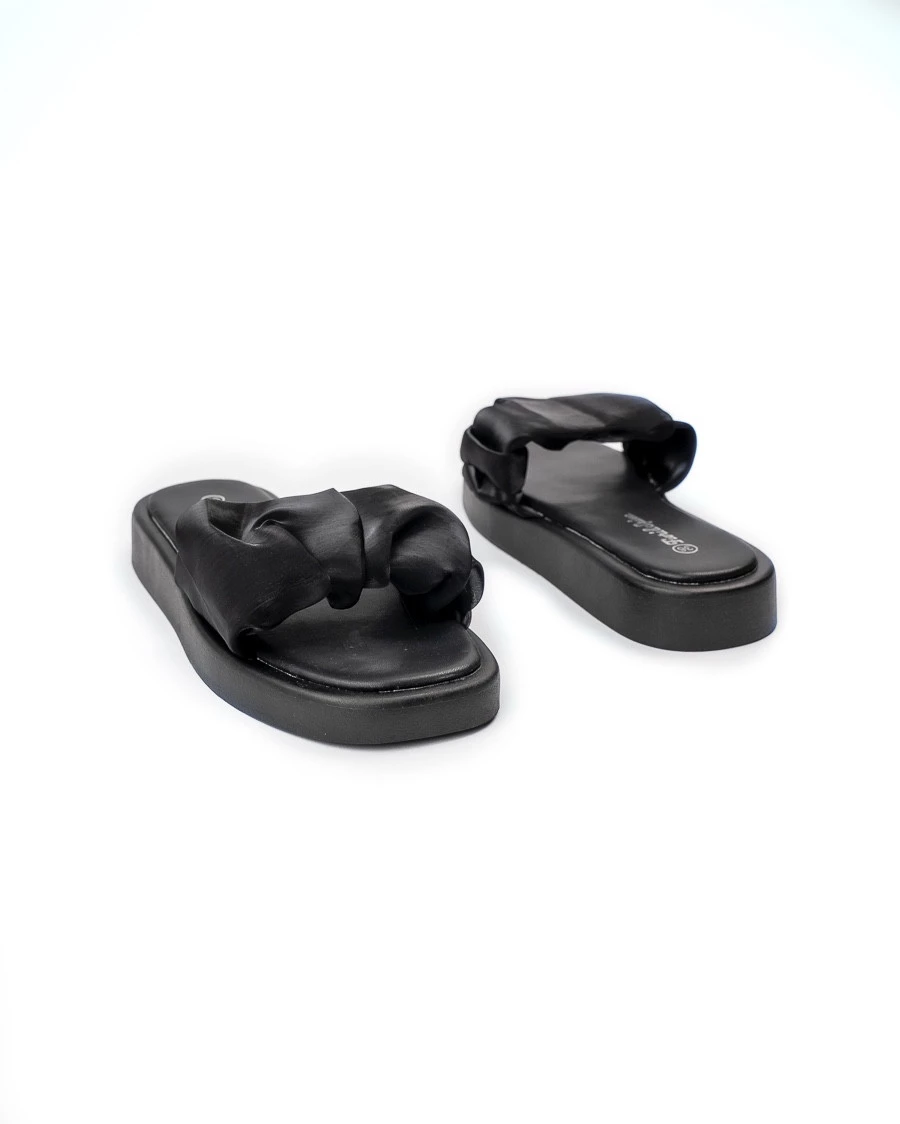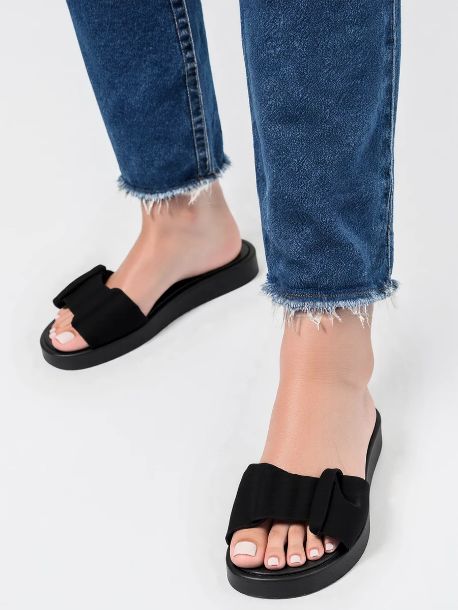 Klapki ZOE (czarne) to elegancka i wygodna opcja na letnie dni. Wykonane z miękkiego materiału z efektownym, szerokim kokardą na cholewce. Posiadają solidną, ale lekką platformę, która zapewnia komfort noszenia przez cały dzień. Czarne wykończenie dodaje im klasy, sprawiając, że pasują do wielu stylizacji.