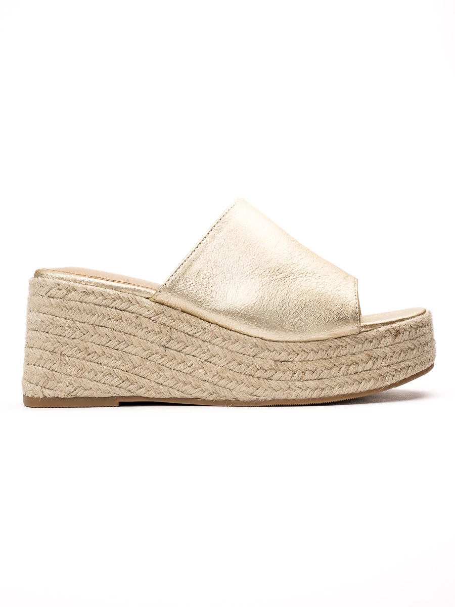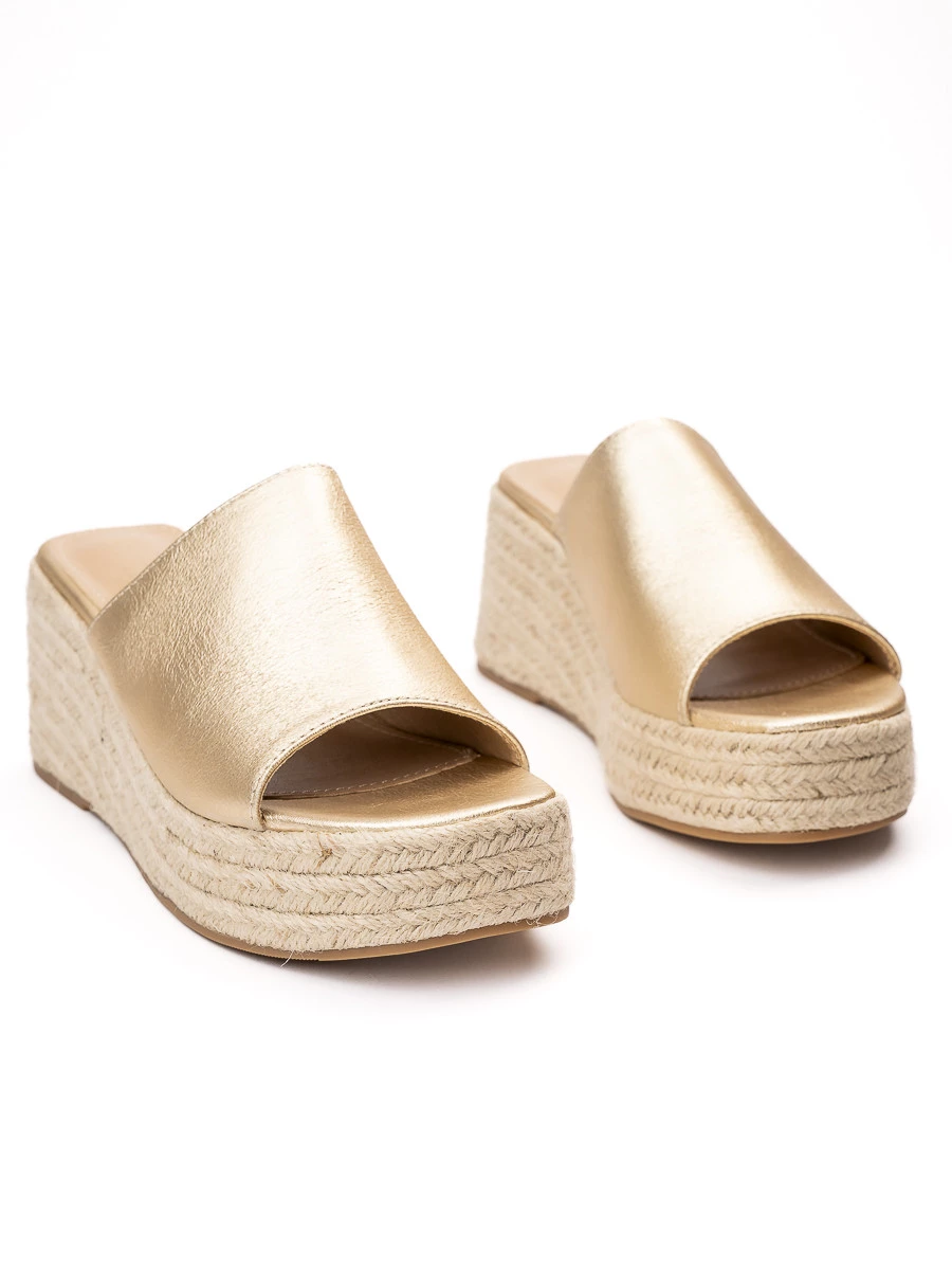 Sandały LORRAINE w kolorze GOLD (złoty) to elegancka propozycja na letnie dni. Wierzch butów wykonany z materiału o metalicznym wykończeniu nadaje im subtelnego blasku. Podeszwa w kształcie platformy i pleciona część z juty zapewniają wygodę i stabilność przez cały dzień. Doskonale pasują do eleganckich stylizacji, a także na letnie wyjścia na miasto czy wakacje.