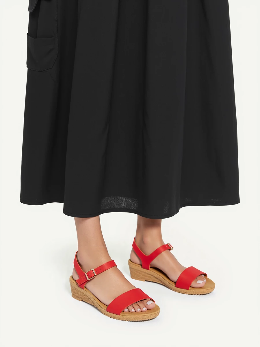 Sandały AURA w kolorze RED (czerwone) to elegancka propozycja na lato, łącząca styl i wygodę. Wykonane z wysokiej jakości materiałów, te sandały z regulowanym paskiem na pięcie i subtelnym paskiem na palcach zapewniają stabilność oraz komfort przez cały dzień. Ich modny design idealnie sprawdzi się na spacery, wakacyjne wyjazdy czy casualowe wyjścia.