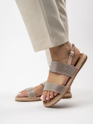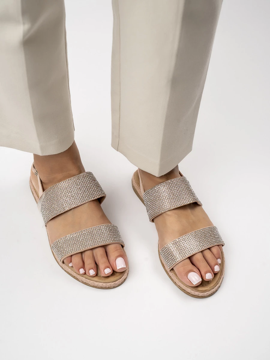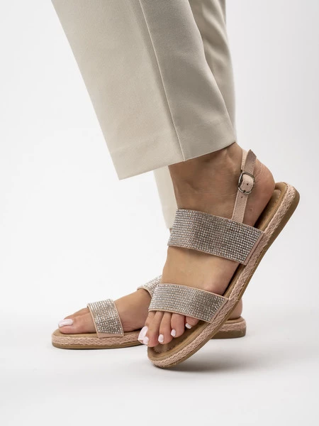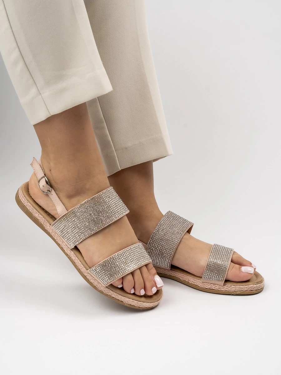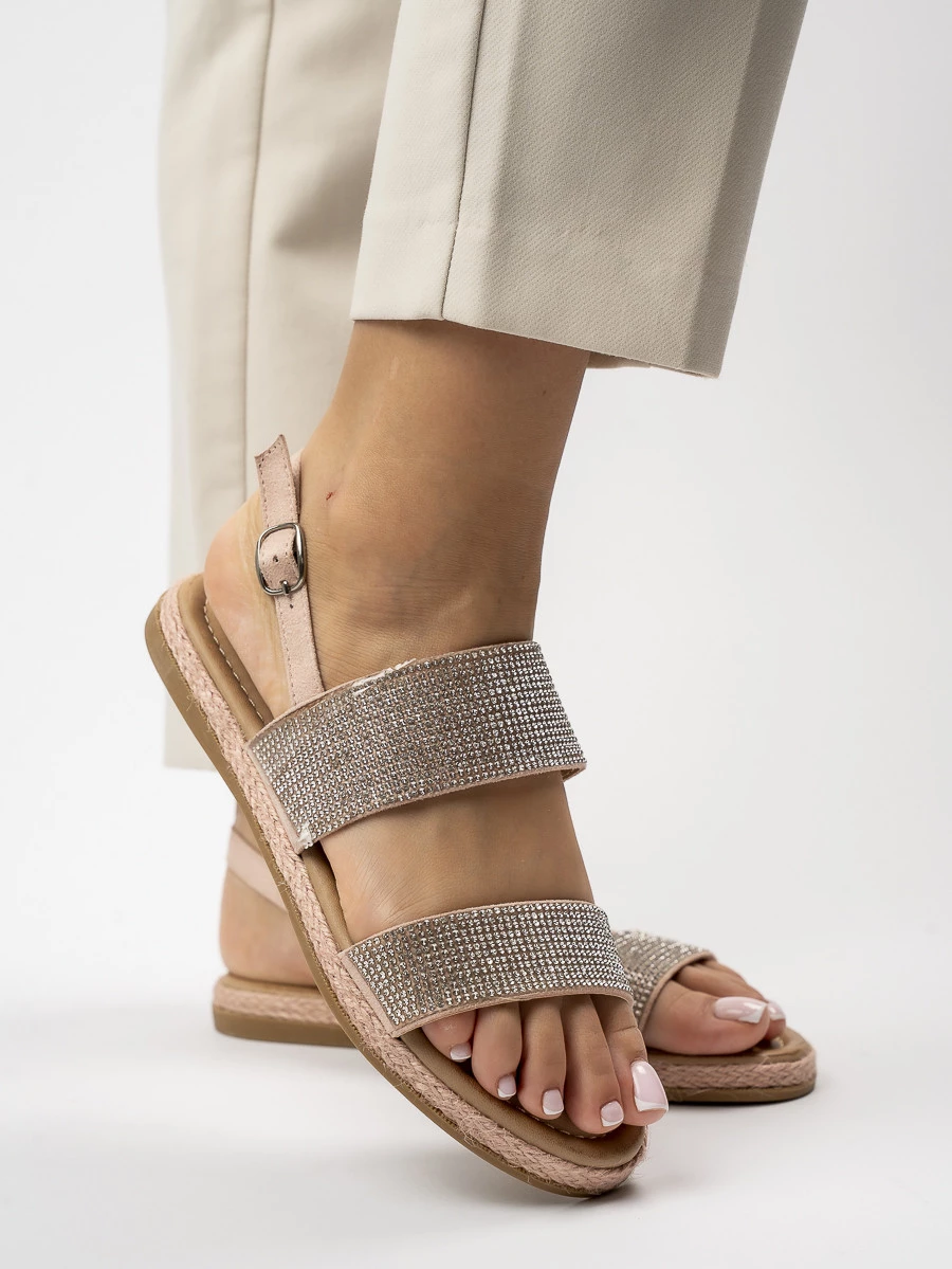 Sandały Viona w kolorze różowym (PINK) to wygodna i kobieca propozycja na lato. Dwa szerokie paski z drobnymi cyrkoniami przyciągają uwagę i nadają eleganckiego blasku. Miękka wkładka i elastyczna podeszwa z delikatnym plecionym rantem zapewniają komfort przez cały dzień. Model idealny do zwiewnych sukienek, miejskich spacerów i letnich wyjść.