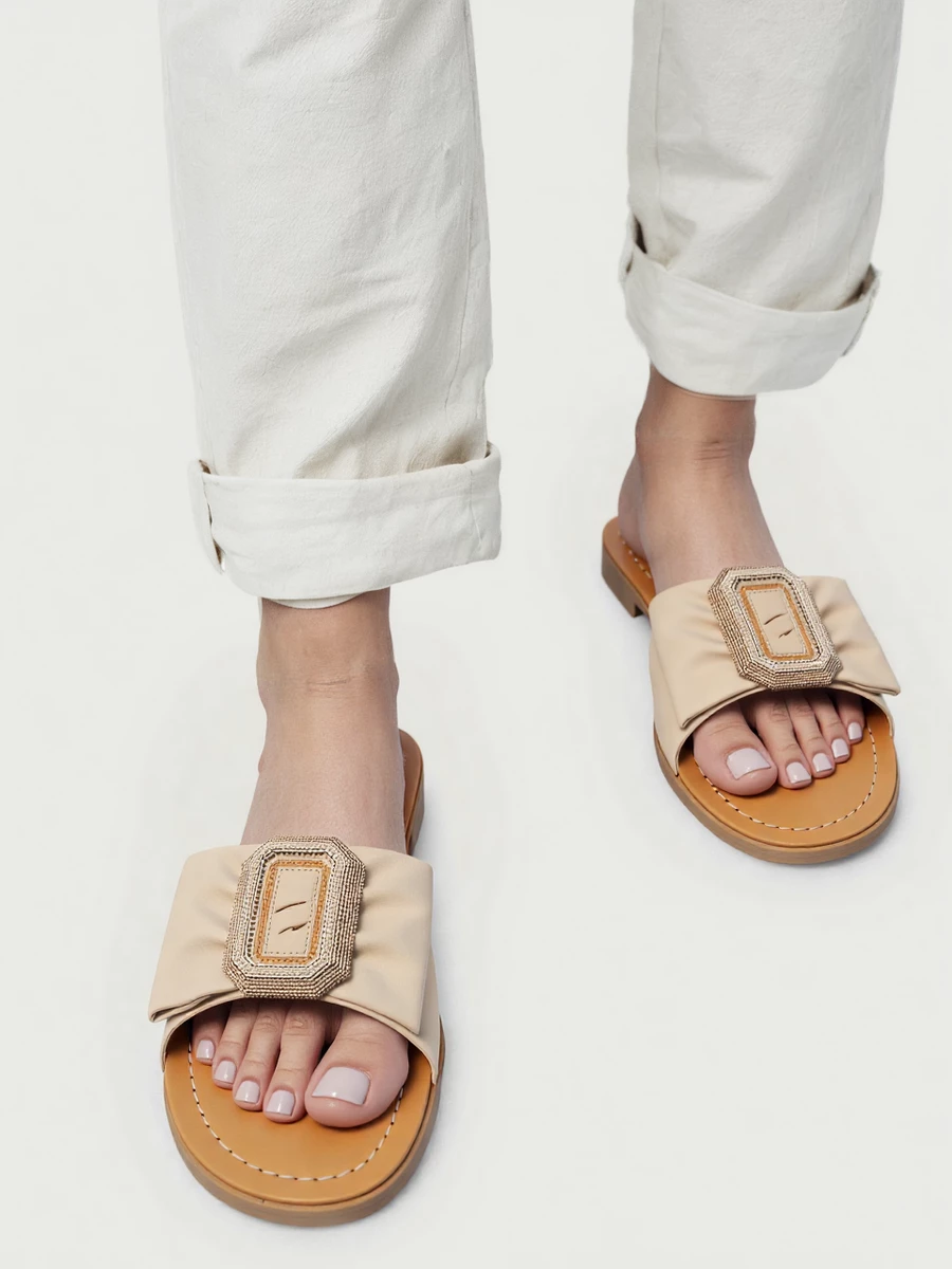 Klapki KARA w kolorze beżowym to klasyka letniej elegancji. Buty posiadają szeroką, dekoracyjną klamrę, która pięknie współgra z miękką podeszwą. Cholewka z wysokiej jakości materiału zapewnia wygodę i komfort, a stylowa podeszwa sprawia, że klapki są idealne na ciepłe dni. Doskonałe na wakacyjne wypady, codzienne spacery czy casualowe spotkania na świeżym powietrzu.