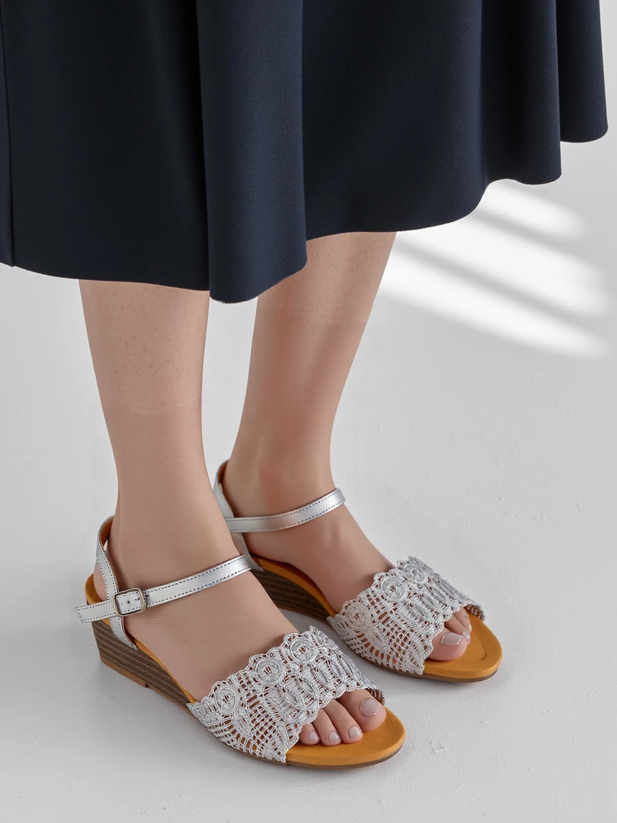 Piękne, eleganckie sandały AURORA w kolorze srebrnym to doskonały wybór na ciepłe dni. Buty o subtelnym, klasycznym designie z lekkim, ale stabilnym podeszwą i zapięciem na pasek zapewniają komfort i styl na każdą okazję. Szeroki pasek na przodzie ozdobiony jest metalicznymi akcentami, które przyciągają wzrok.