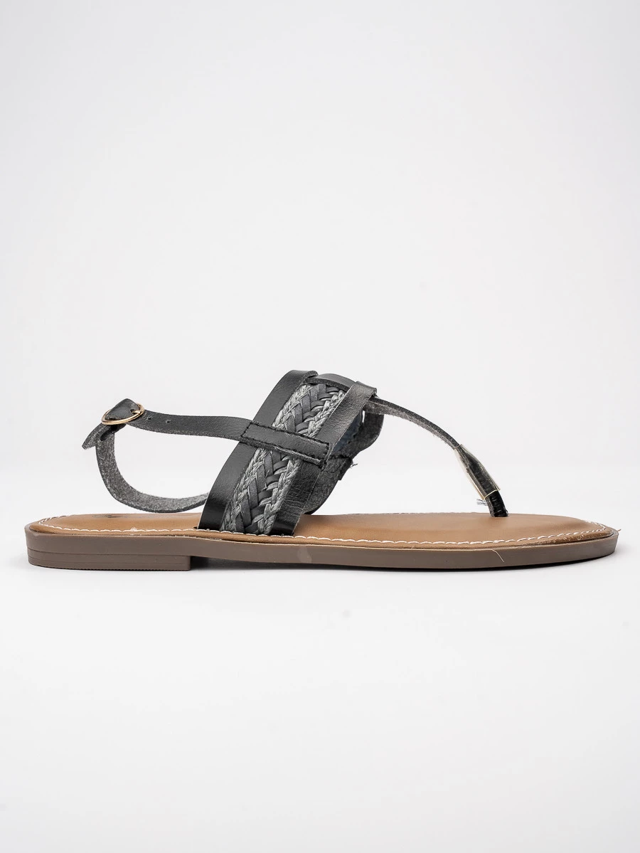 Damskie Sandały LARA BLACK to idealne połączenie stylu boho z komfortem na co dzień. Wykonane z czarnej ekoskóry paski – w tym jeden efektownie pleciony – krzyżują się na śródstopiu i nadają sandałom wyjątkowego charakteru. Model uzupełniony został o pasek typu japonka, który stabilnie trzyma stopę, oraz regulowany pasek na kostce. Lekka, płaska podeszwa sprawdzi się podczas letnich spacerów i codziennego użytkowania.
