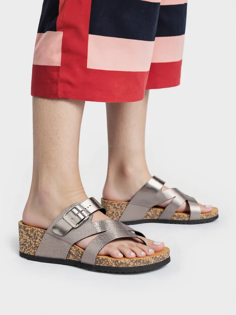 Klapki Arista w kolorze grafitowym (PEWTER) to wygodna i stylowa propozycja na lato. Krzyżujące się paski z połyskującego materiału oraz ozdobna klamra dodają im charakteru. Wkładka imitująca korek oraz lekko podwyższona podeszwa zapewniają komfort podczas noszenia na co dzień. Idealne do letnich stylizacji — zarówno na spacer, jak i na wakacyjne wyjazdy. Klapki Arista łączą funkcjonalność z nowoczesnym wyglądem.