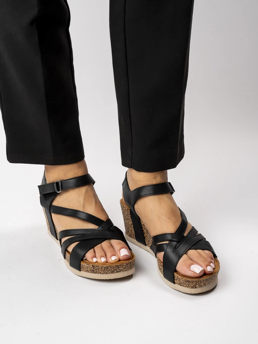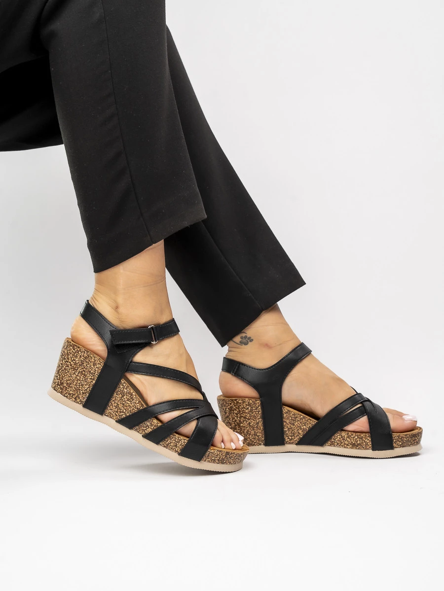 • Eleganckie czarne sandały na koturnie, idealne na lato.