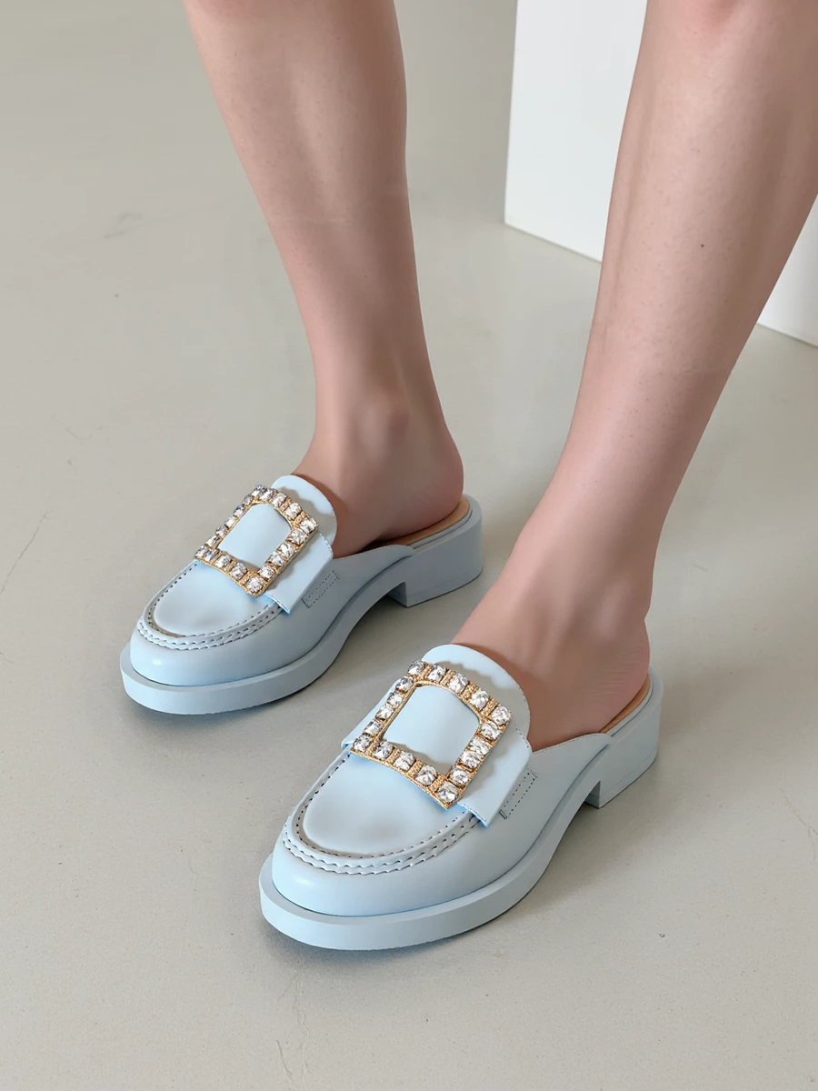 Klapki Elowen w kolorze niebieskim (BLUE) to wyjątkowe połączenie elegancji i komfortu. Model z odkrytą piętą i masywną klamrą zdobioną kryształkami przyciąga wzrok i nadaje stylizacji charakteru. Profilowana podeszwa oraz stabilny, niski obcas gwarantują wygodę przez cały dzień. Idealne do letnich outfitów – zarówno do sukienki, jak i spodni.