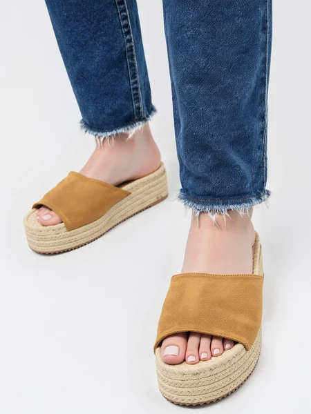 Modne i wygodne klapki Estilo w kolorze camel, idealne dla każdego, kto ceni sobie zarówno styl, jak i komfort. Konstrukcja z miękkiego zamszu zapewnia wyjątkową wygodę podczas użytkowania, natomiast pleciona podeszwa espadrylowa dodaje butom unikalnego charakteru. Te klapki świetnie sprawdzą się w cieplejsze dni, będą pasować zarówno do casualowych jak i nieco bardziej eleganckich letnich stylizacji.