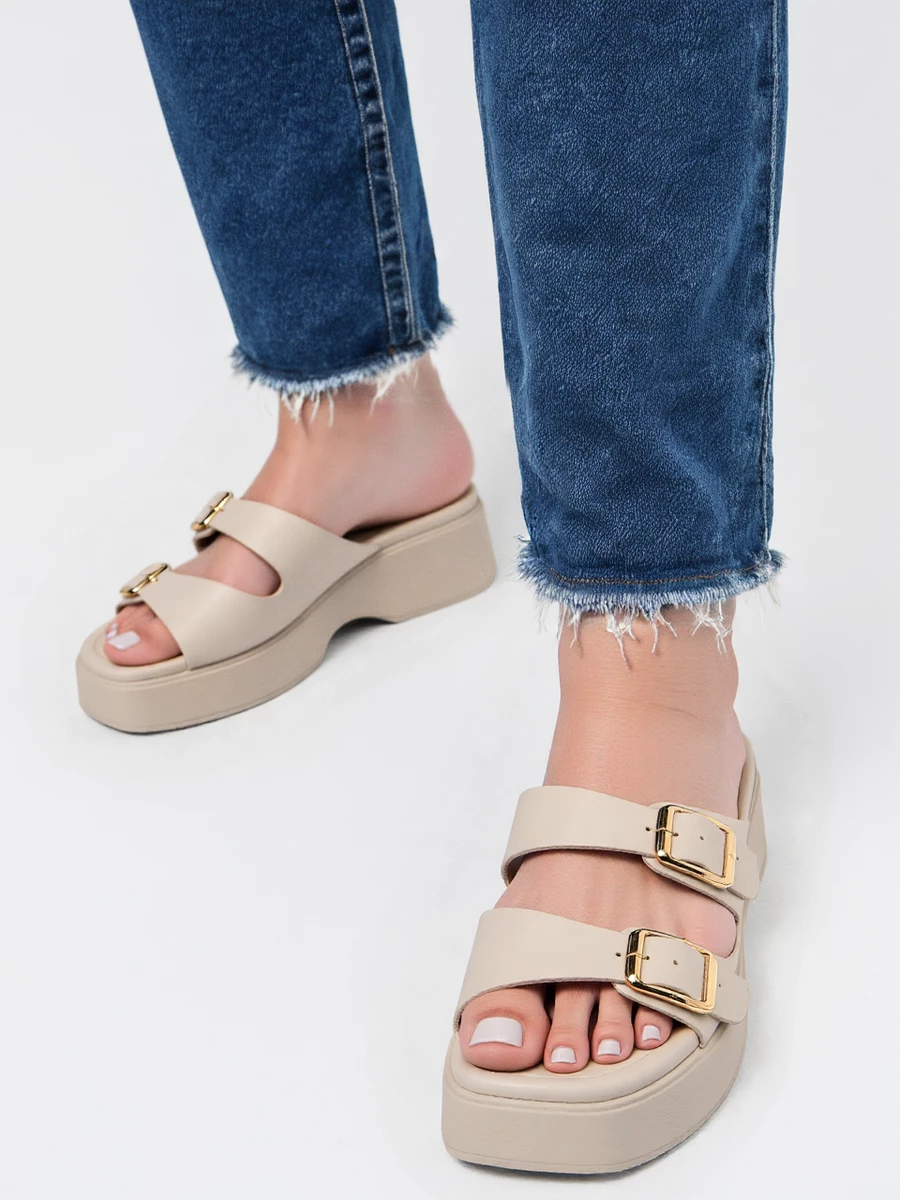 Prezentujemy eleganckie i wygodne klapki "Eleganza", które będą idealnym dodatkiem do Twojej letniej garderoby. Wykonane z wysokiej jakości materiałów, te klapki zapewniają komfort na co dzień oraz podczas letnich spacerów. Zdobione dyskretnymi, złotymi klamrami, dodają elegancji każdemu strojowi.