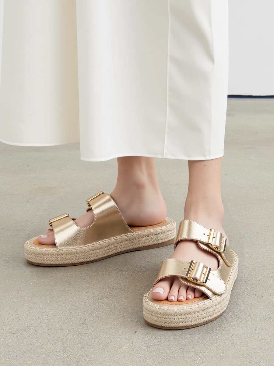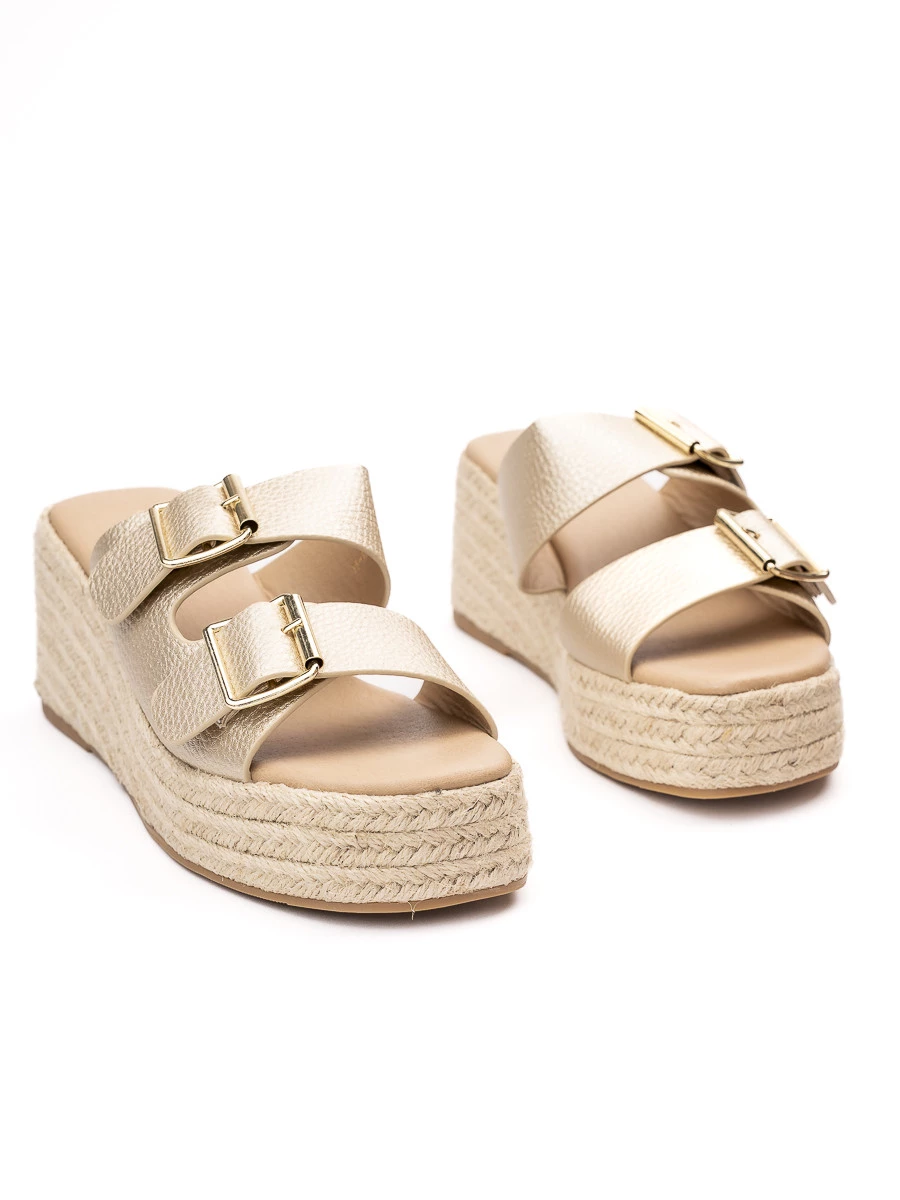 Klapki Złociste Luksus to kwintesencja letniego stylu połączona z elementami luksusu. Idealne do casualowych letnich stylizacji, te sandały wyróżniają się złotą, błyszczącą powierzchnią oraz podeszwą imitującą plecionkę, co dodaje im unikatowego charakteru. Regulowane paski zapewniają indywidualne dopasowanie, a miękka podszewka skutecznie chroni stopy przed otarciami.