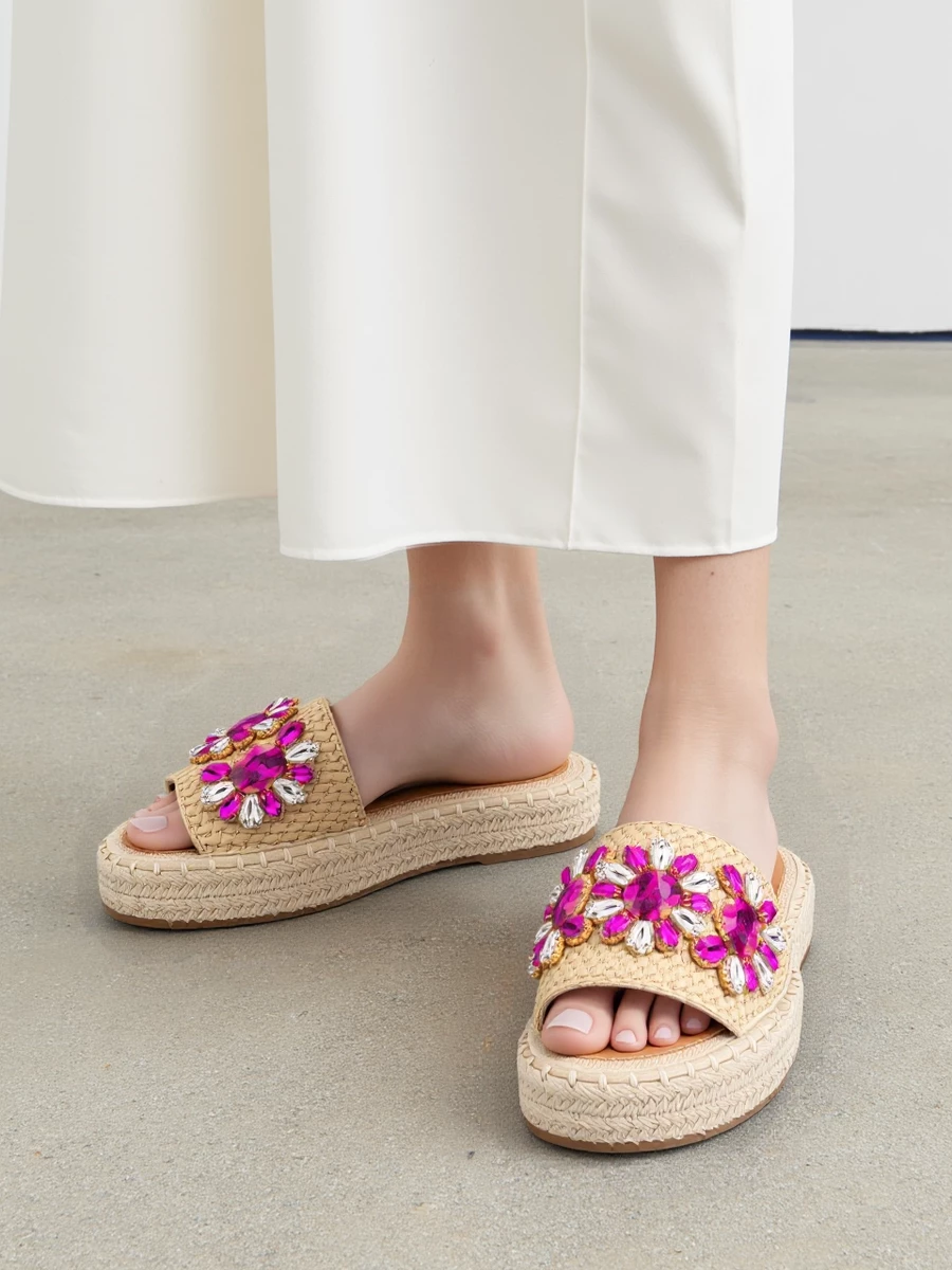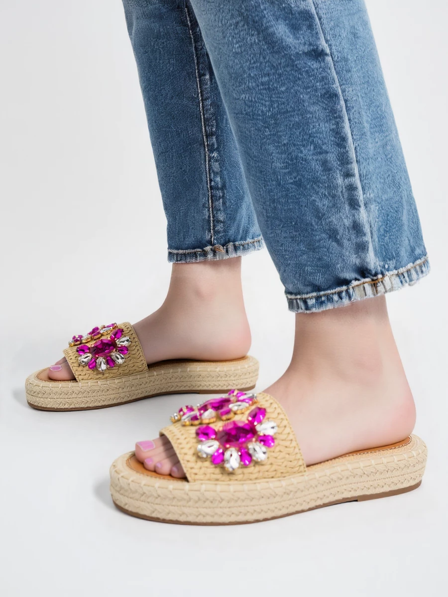 Klapki DIVAGLAM w kolorze fuksjowym (fuksjowe) to połączenie elegancji i letniego luzu. Model ten wyróżnia się plecioną podeszwą espadrylową, która nadaje butom wakacyjny charakter. Cholewka została ozdobiona przepięknymi, kolorowymi kamieniami w odcieniach fuksji i różu, co czyni je wyjątkowo efektownymi i nadaje im elegancki wygląd.
