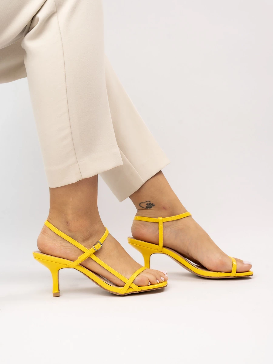 Sandały SOLARA w kolorze żółtym (żółte) to połączenie lekkości i kobiecego wdzięku. Minimalistyczny design z delikatnymi paseczkami i lakierowanym wykończeniem nadaje całości eleganckiego charakteru. Niewysoki, stabilny obcas typu kaczuszka zapewnia komfort nawet podczas długiego noszenia.