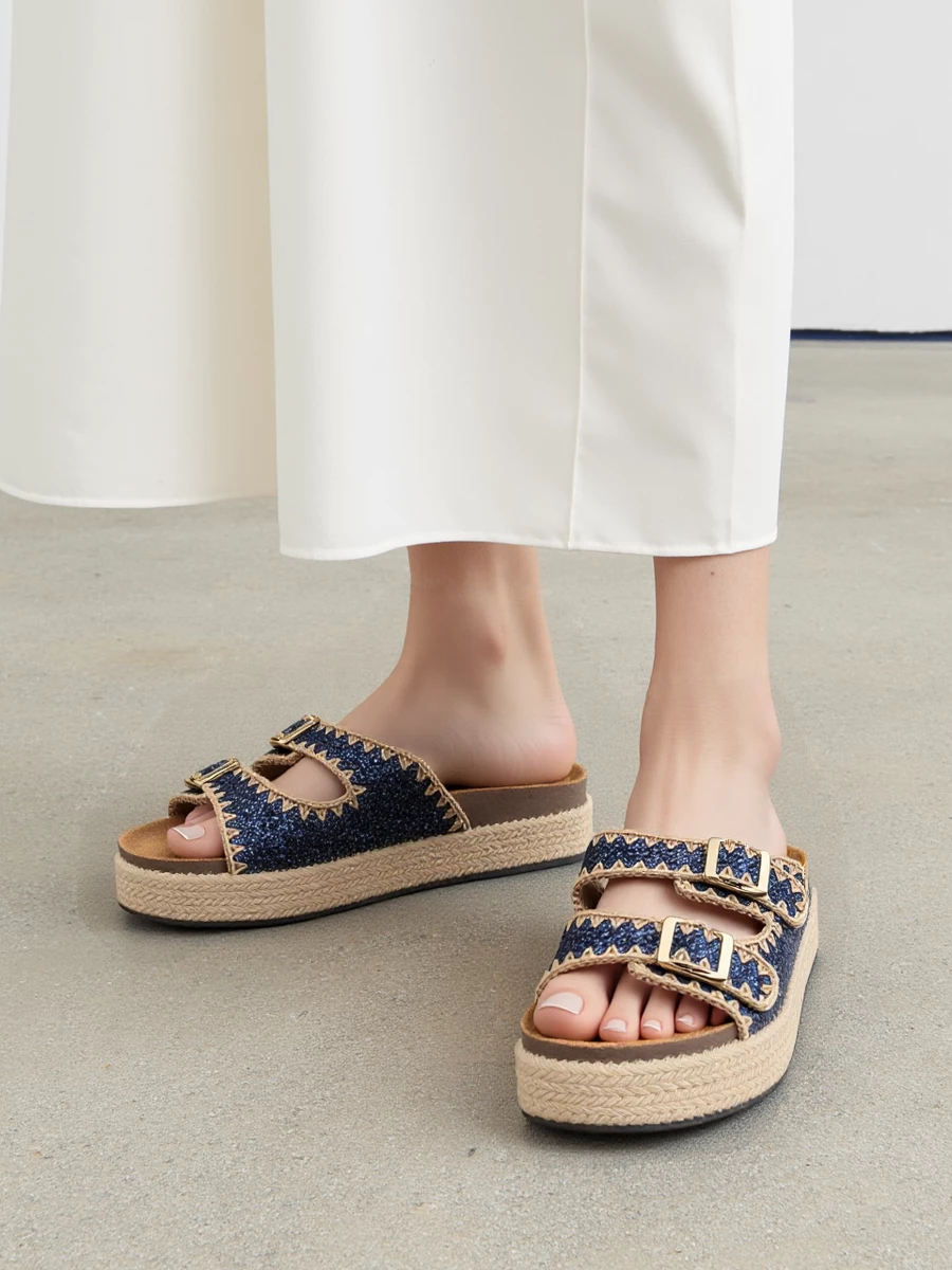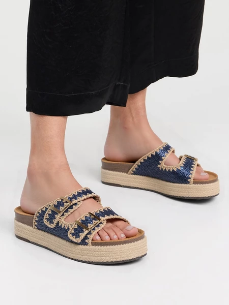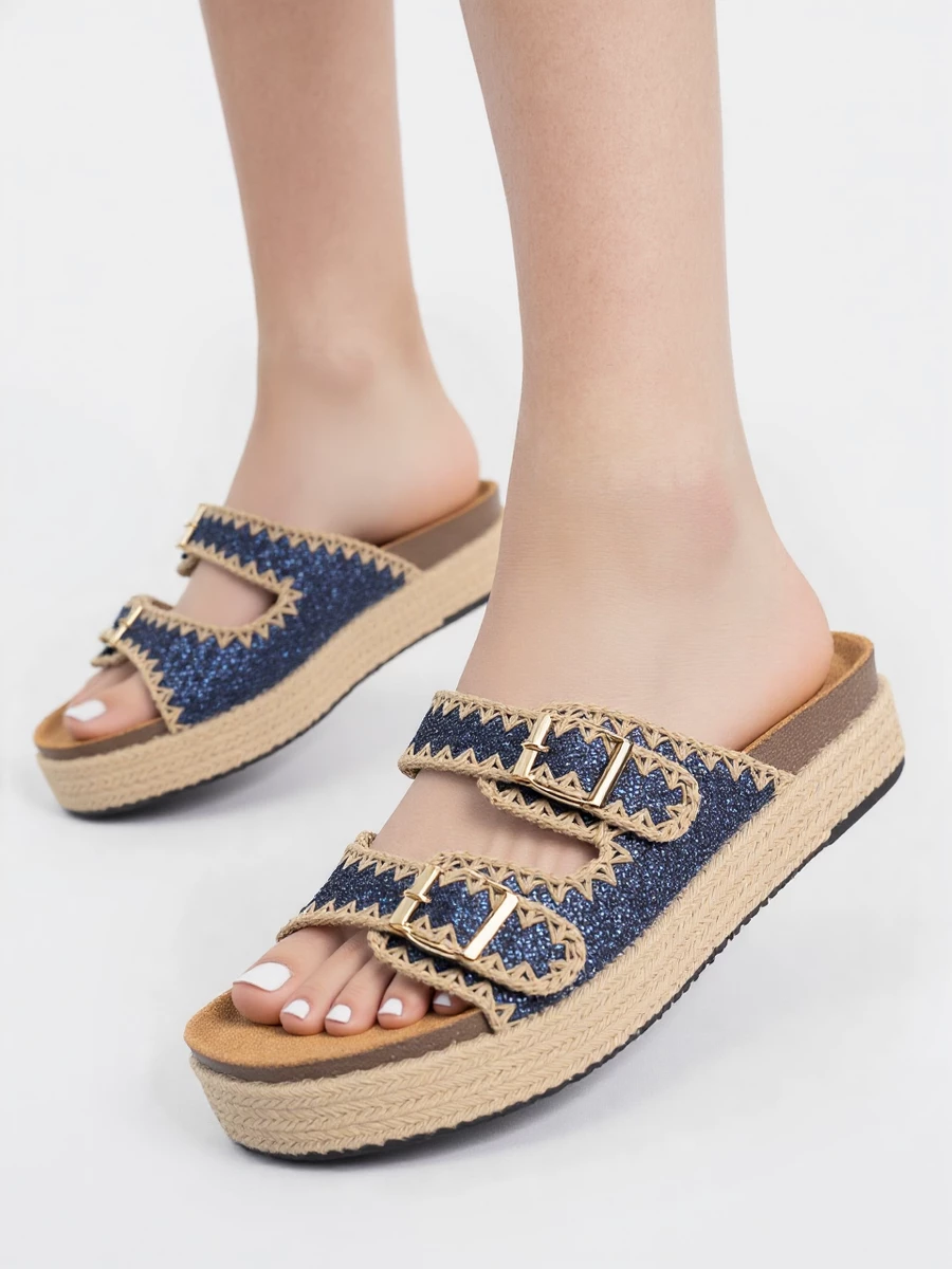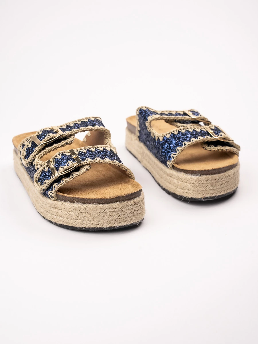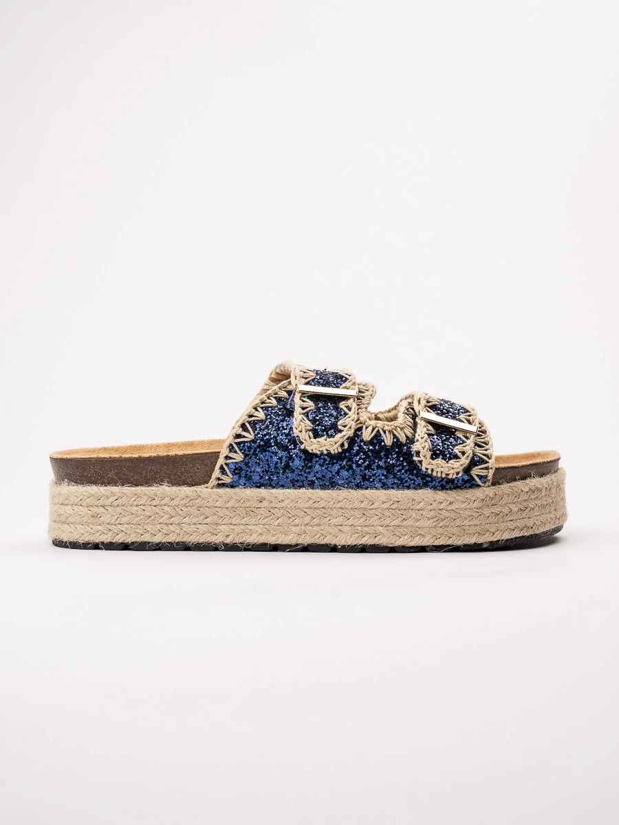 Klapki na koturnie w kolorze Blue to idealny wybór dla kobiet poszukujących stylowego i wygodnego obuwia letniego. Te klapki wyróżniają się błyszczącymi, niebieskimi paskami, które dodają im elegancji i przyciągają wzrok. Wykonane z juty podeszwy w stylu espadrylowym oraz dwie klamry zapewniają idealne dopasowanie i komfort noszenia. Niezależnie od tego, czy wybierasz się na plażę czy spacer po mieście, te klapki będą doskonałym uzupełnieniem każdej letniej stylizacji w kolorze Blue.