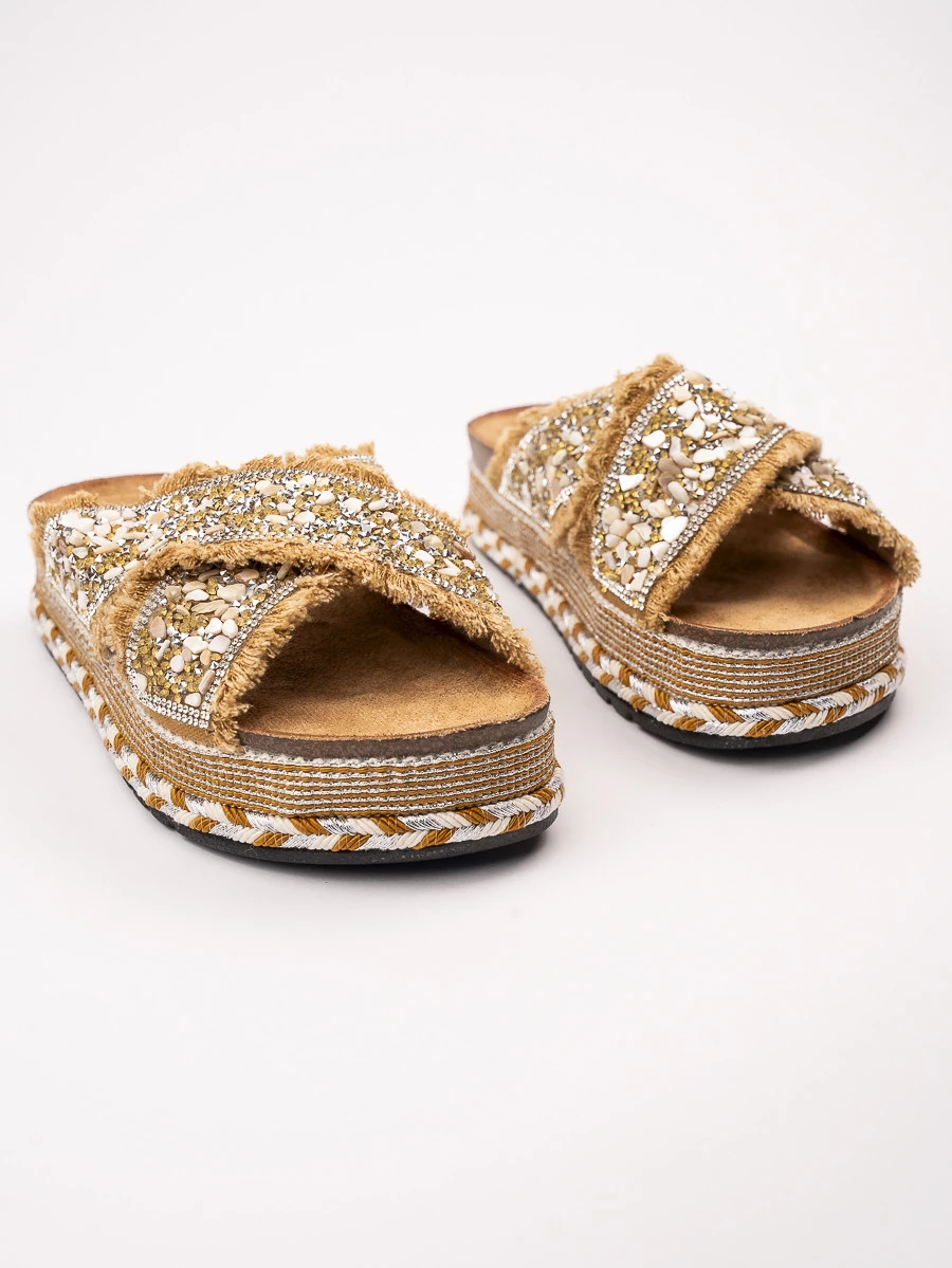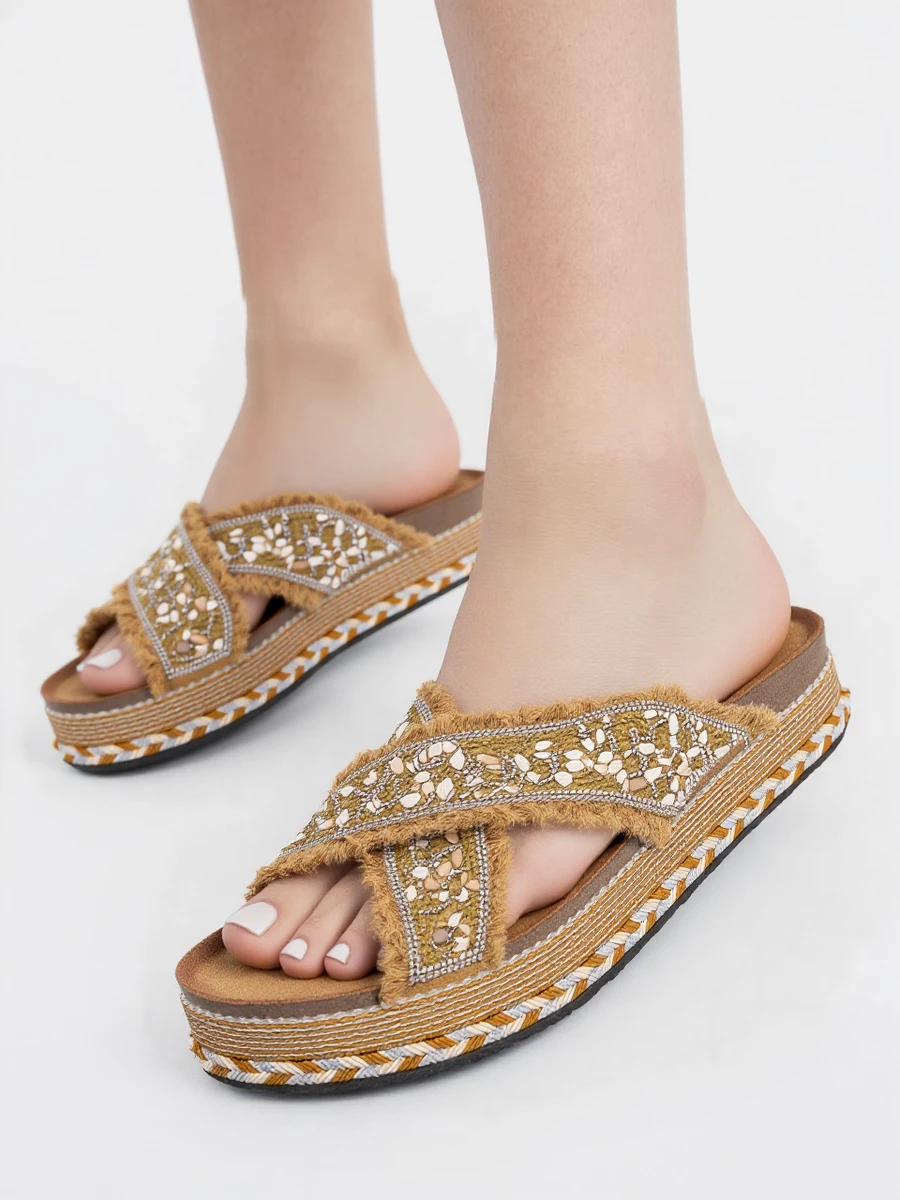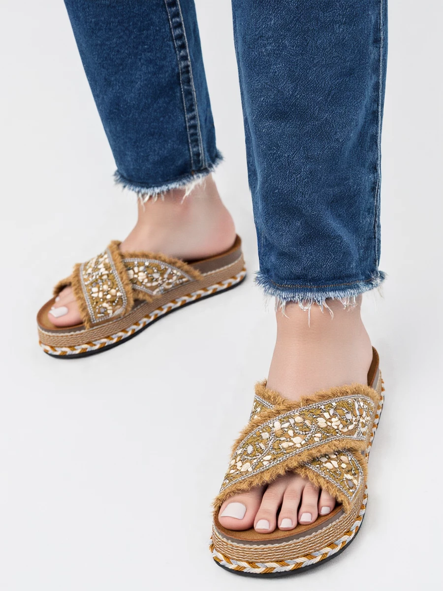 Idealne na letnie dni, te klapki charakteryzują się ręcznie zdobionymi detalami i naturalnymi materiałami, które podkreślają ich unikalny charakter.