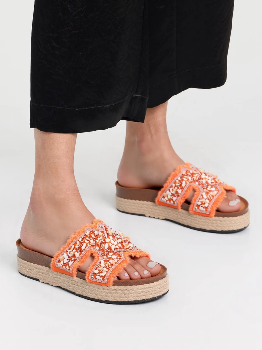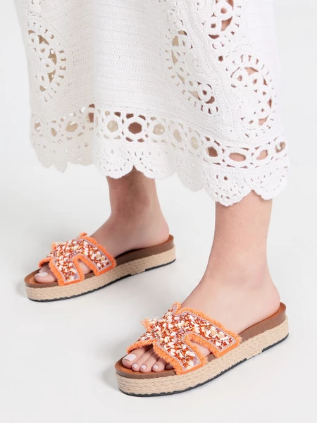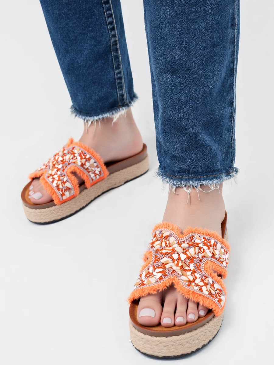 Klapki na koturnie damskie z haftem w kolorze Orange