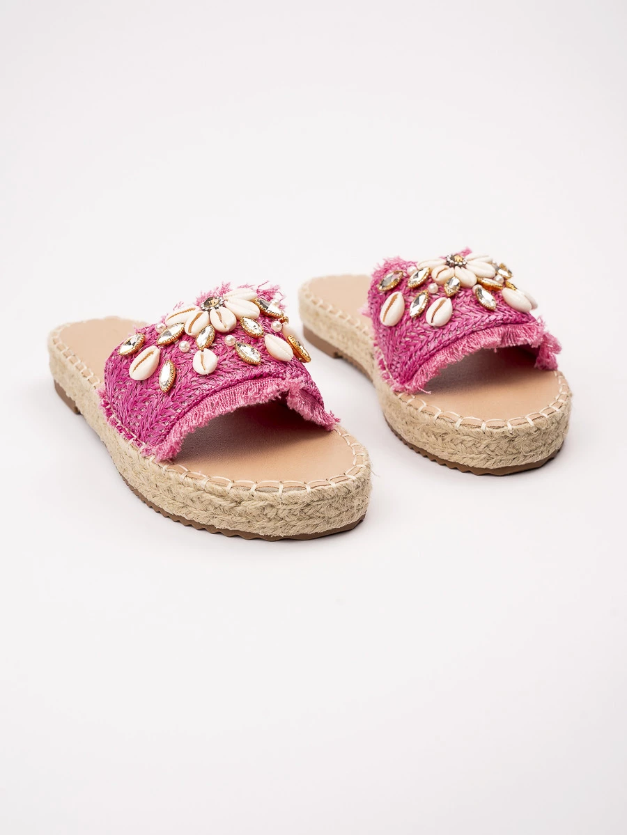 Ozdobne muszle i koraliki na pasku nadają im niepowtarzalnego charakteru, a wyściełana podeszwa zapewnia komfort podczas chodzenia.