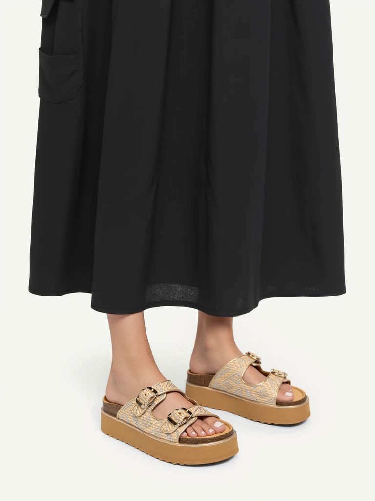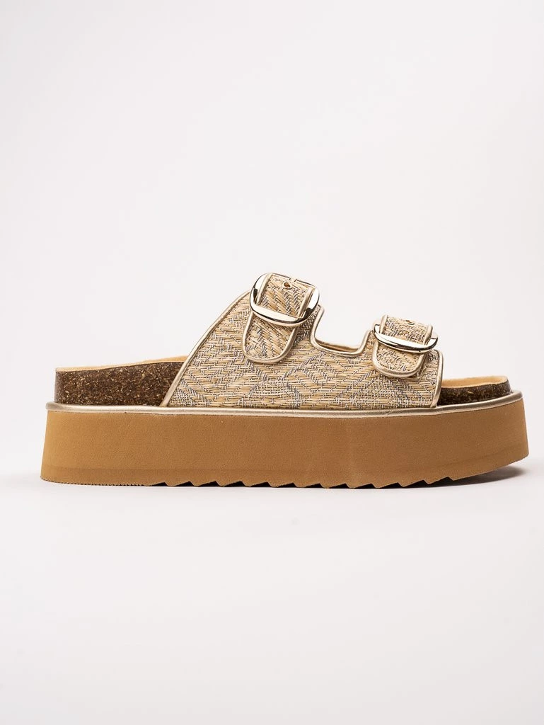 Stylowe klapki na koturnie z podwójną klamrą w kolorze Silver to idealny wybór na letnie dni. Wykonane z wysokiej jakości materiałów, zapewniają komfort i modny wygląd. Srebrny kolor dodaje elegancji, a solidna podeszwa gwarantuje stabilność.