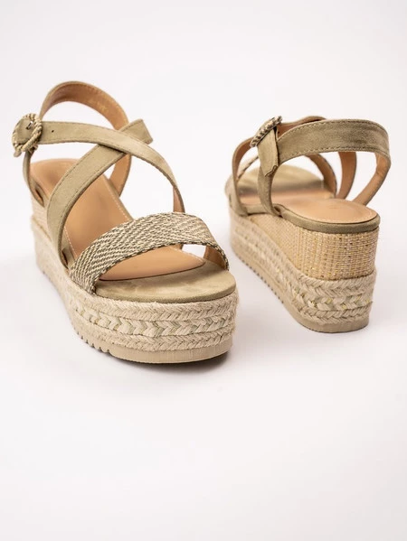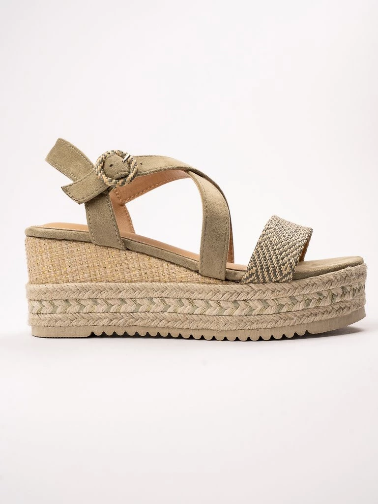 Stylowe sandały na koturnie z plecionką w kolorze Green to idealny wybór na letnie dni. Wykonane z wysokiej jakości materiałów, zapewniają komfort i elegancję. Regulowane paski i ozdobna klamra dodają uroku i funkcjonalności.