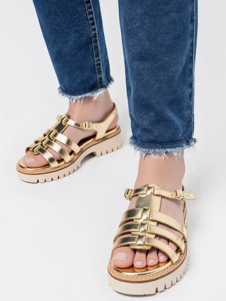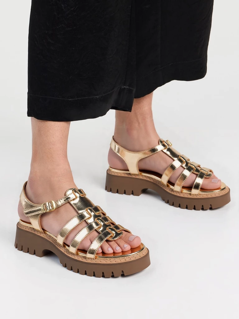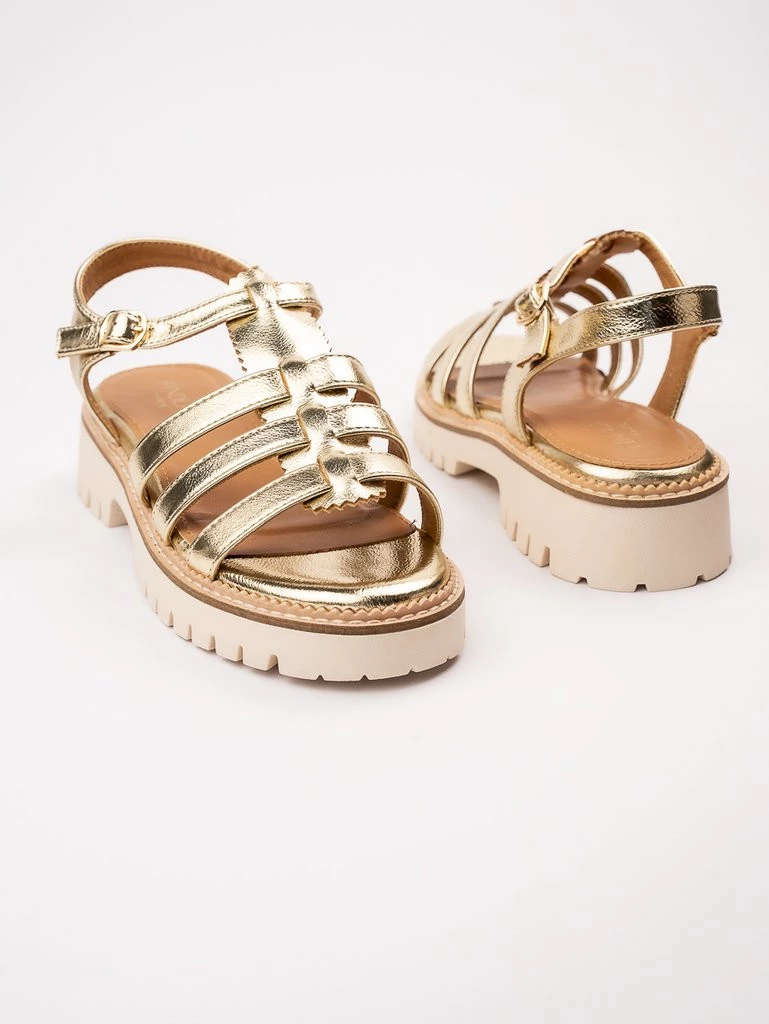 • Modne Sandały na obcasie damskie w kolorze Gold.