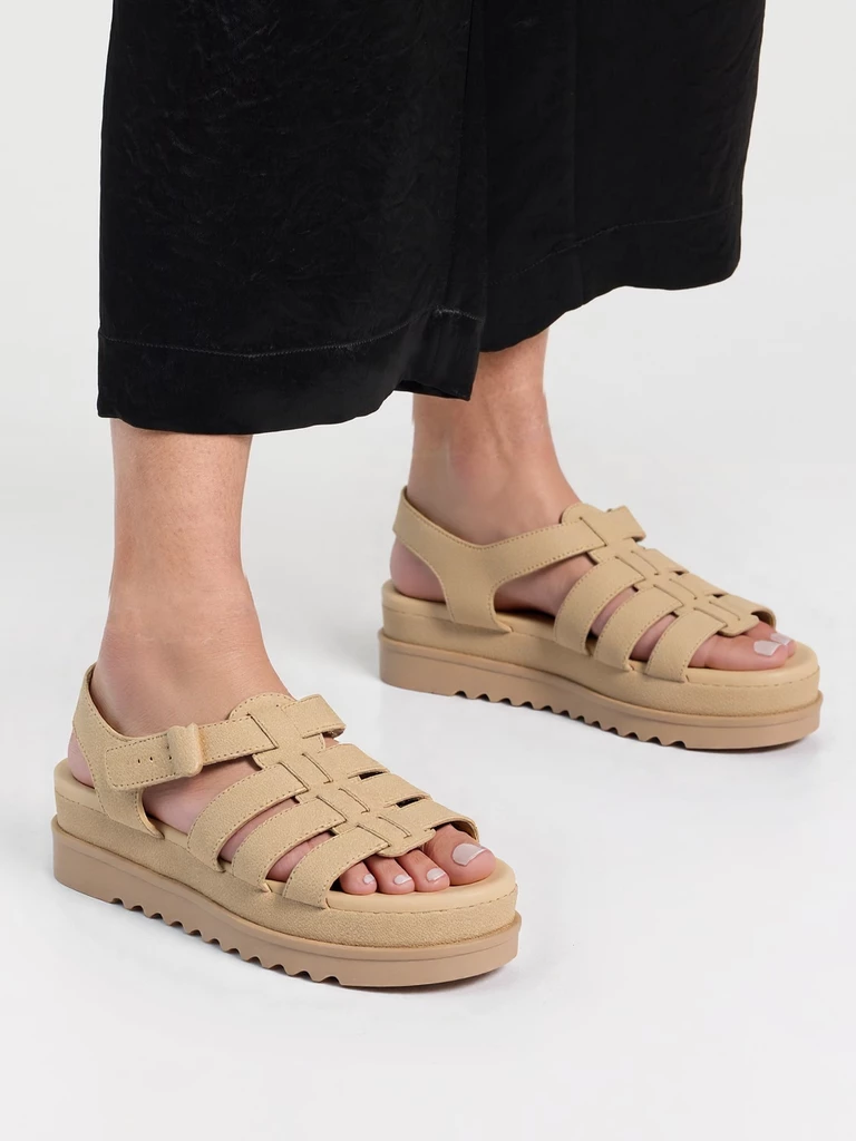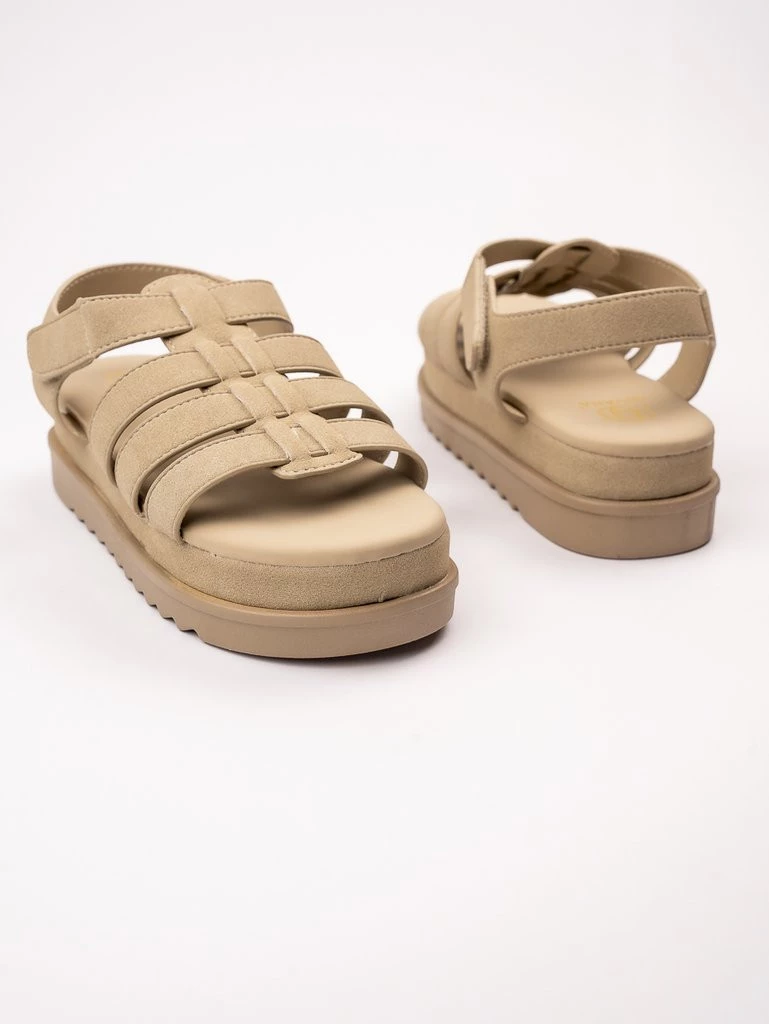 Stylowe sandały na koturnie z paskami w kolorze Khaki to idealny wybór na letnie dni. Wygodne zapięcie na rzep zapewnia komfort noszenia, a elegancka konstrukcja dodaje uroku każdej stylizacji.