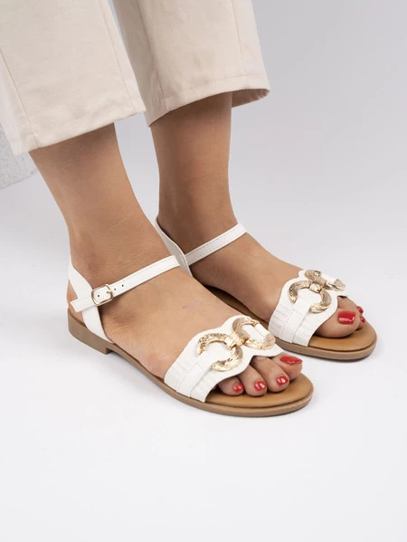 Te eleganckie sandały płaskie wyróżniają się subtelnym, ale efektownym designem, idealnym na letnie dni. Wykonane z wysokiej jakości skóry, zapewniają komfort podczas całodziennego noszenia. Złota ozdobna klamra dodaje im stylu i elegancji, czyniąc je idealnymi do codziennych i oficjalnych stylizacji. Regulowane zapięcie pozwala na idealne dopasowanie do stopy, co zwiększa wygodę użytkowania. Te sandały w kolorze White doskonale komponują się zarówno z casualowymi, jak i bardziej eleganckimi stylizacjami.