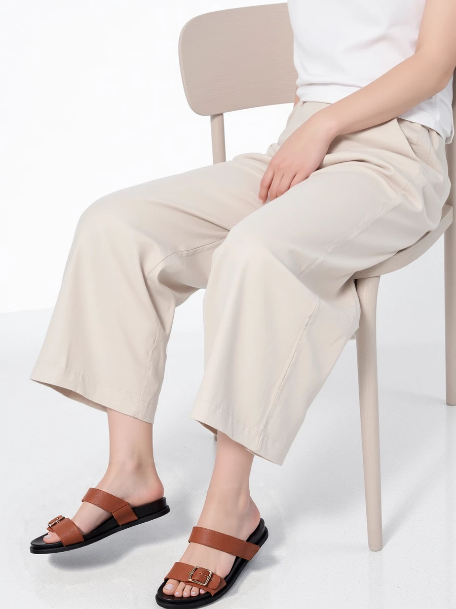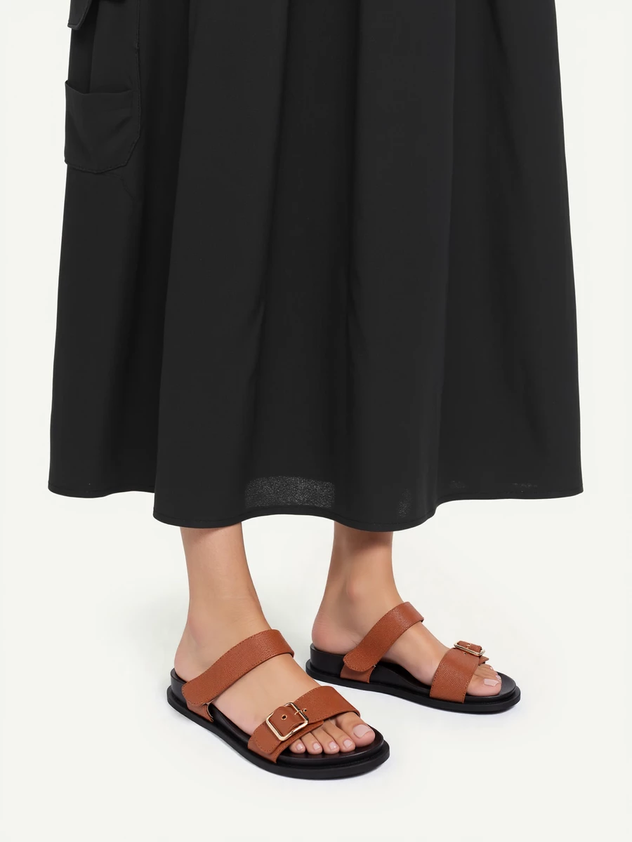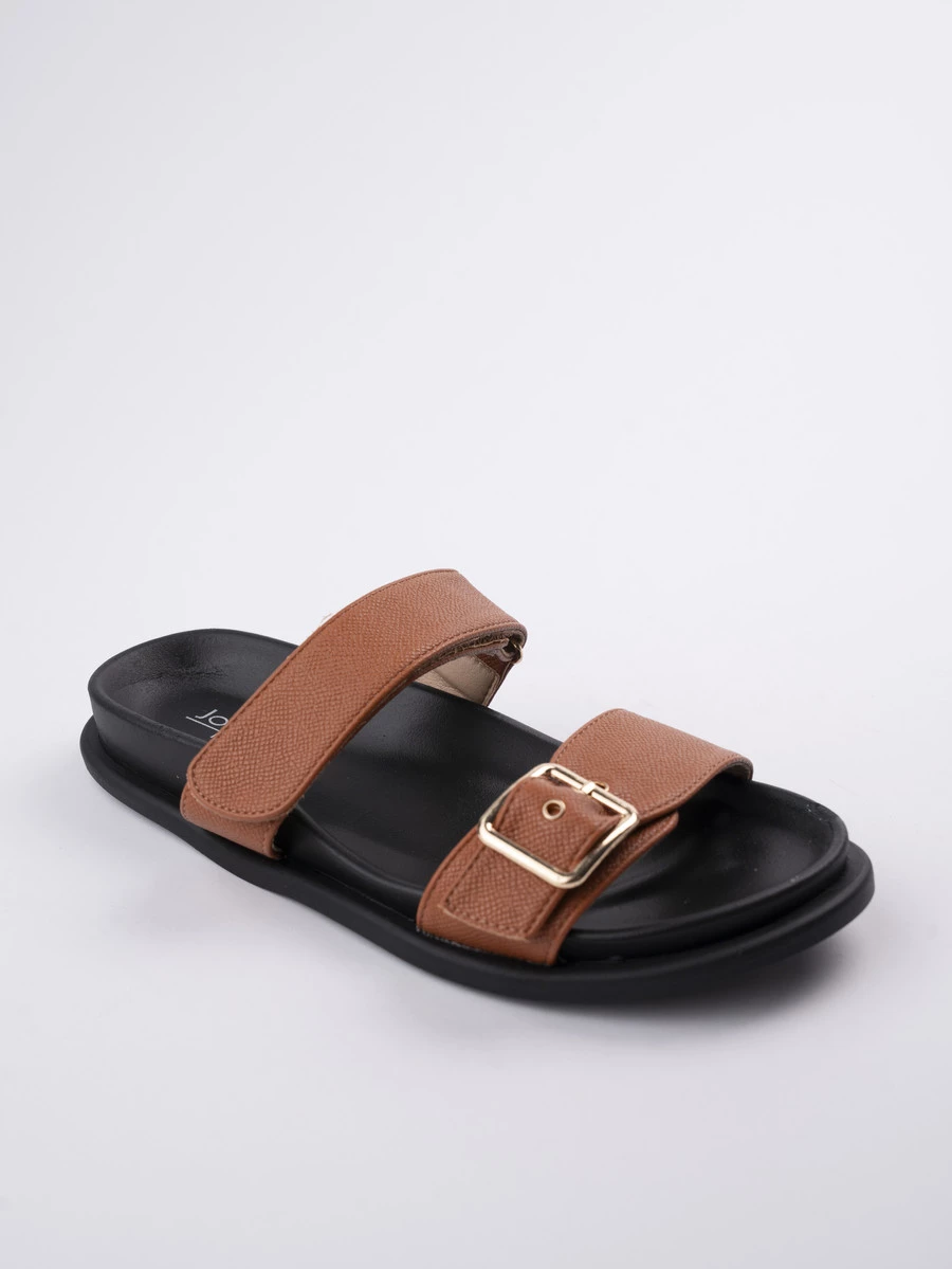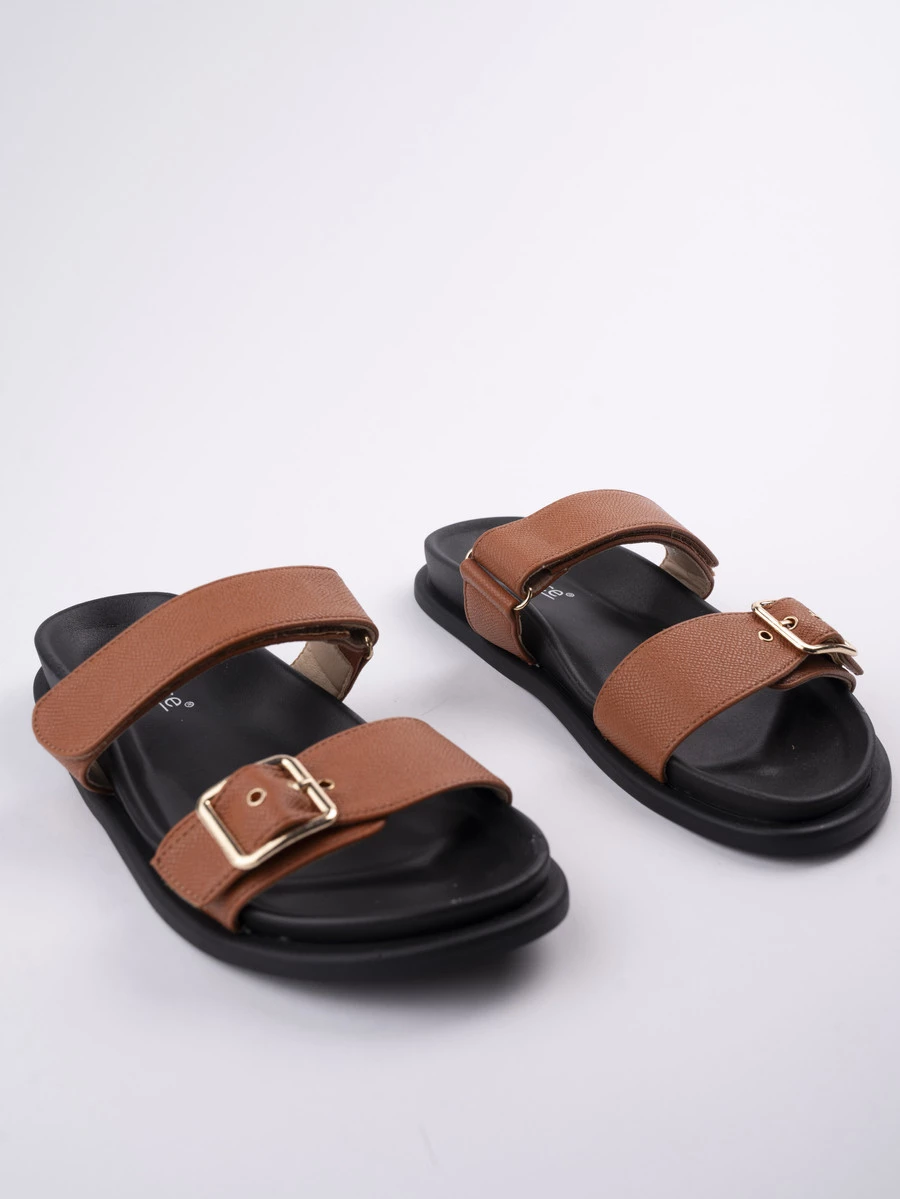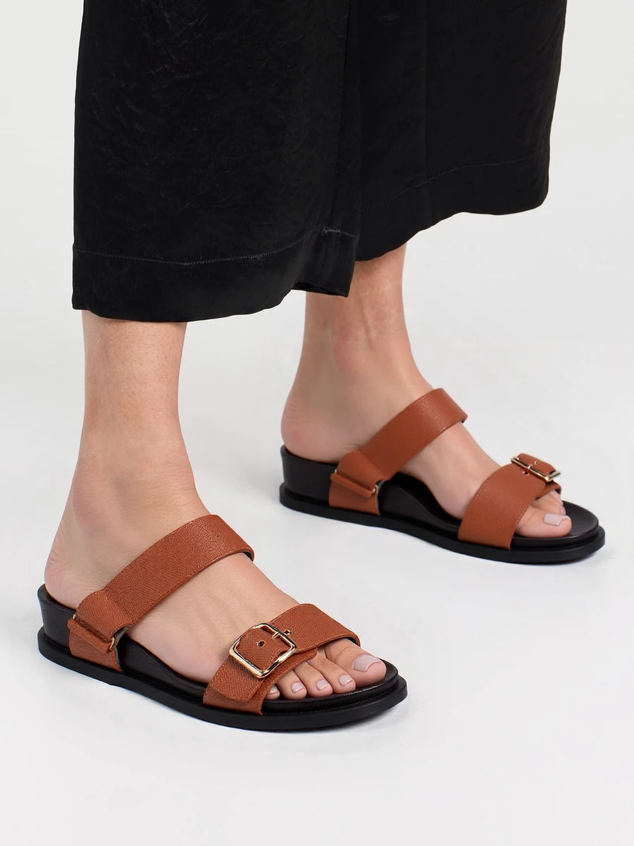 • Modne Klapki płaskie damskie w kolorze Camel.