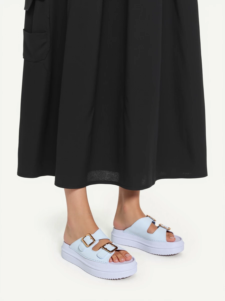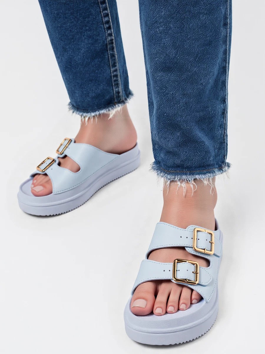 Te modne klapki na koturnie z pewnością przyciągną spojrzenia dzięki eleganckim skórzanym paskom i solidnym metalowym klamrom w kolorze złota. Wysoka platforma zapewnia dodatkowy komfort, czyniąc je idealnym wyborem na długie spacery. Klapki w kolorze Blue idealnie komponują się z casualowymi stylizacjami, dodając im szyku i nowoczesnej elegancji. Idealne na lato, łączą w sobie styl i wygodę, co czyni je niezastąpionym elementem garderoby każdej kobiety.