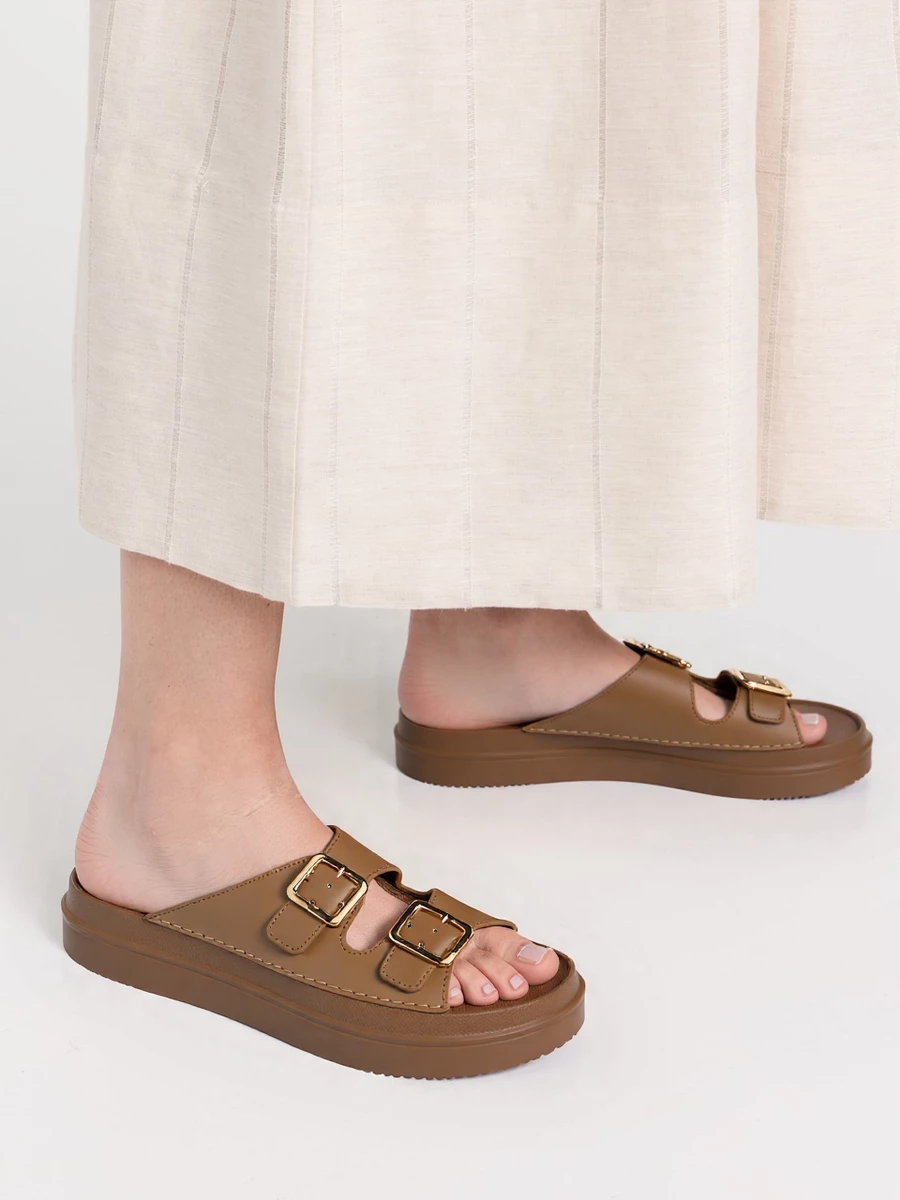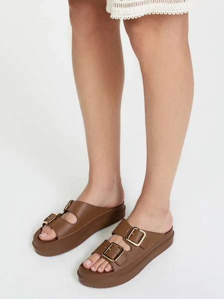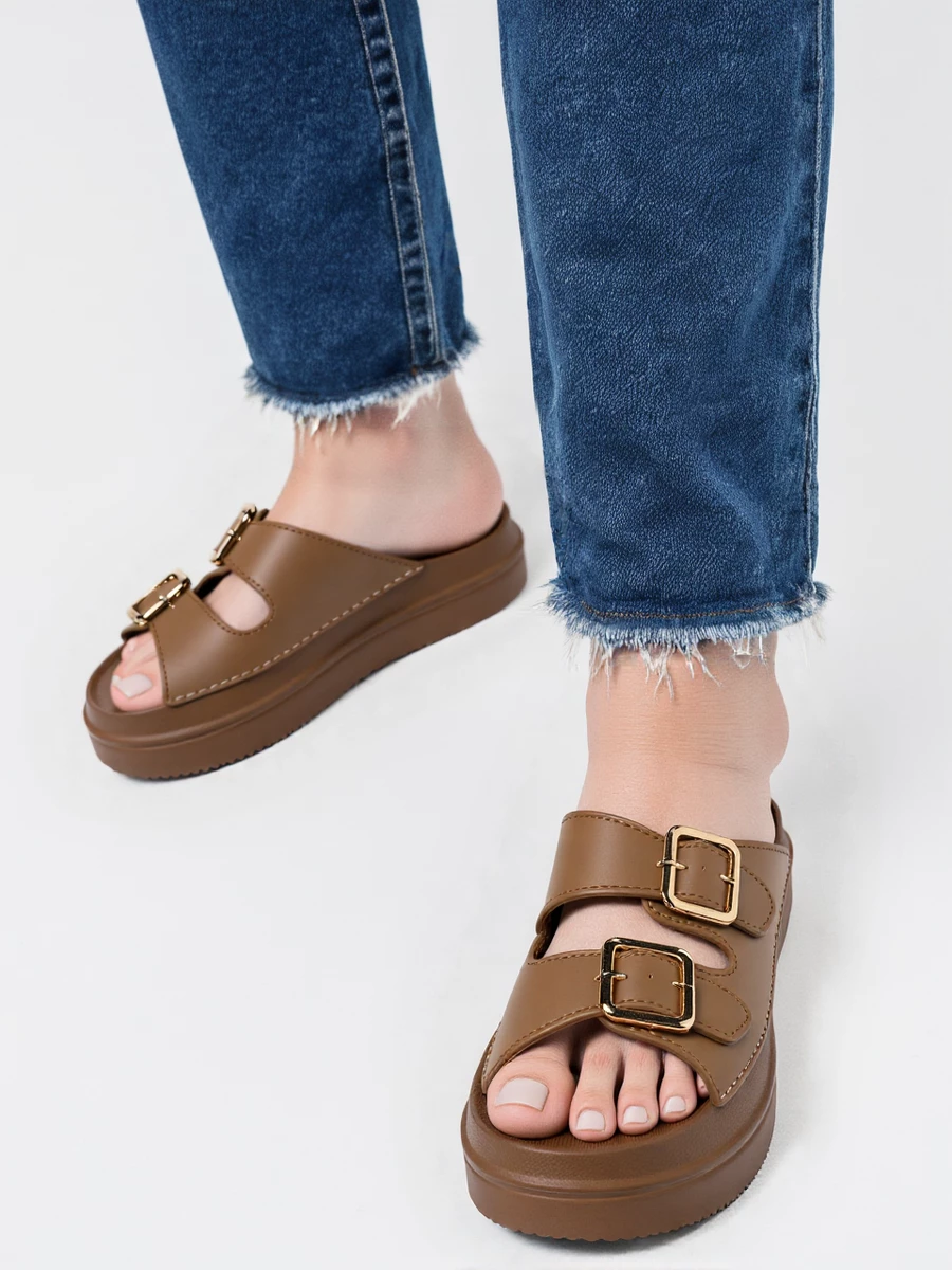 Te eleganckie klapki na koturnie wyróżniają się stylowymi skórzanymi paskami oraz efektownymi metalowymi klamrami. Wykonane z wysokiej jakości materiałów, gwarantują wygodę i trwałość. Platforma dodaje wysokości bez rezygnacji z komfortu, dzięki czemu idealnie nadają się na każdą okazję. Ich uniwersalny kolor Khaki łatwo dopasujesz do letnich stylizacji, dodając im modnego akcentu. Niezależnie od tego, czy wybierasz się na spacer, czy spotkanie ze znajomymi, te klapki będą doskonałym wyborem.