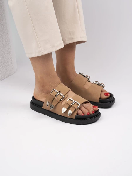 Klapki damskie z klamrami i skórzanymi paskami w kolorze Camel