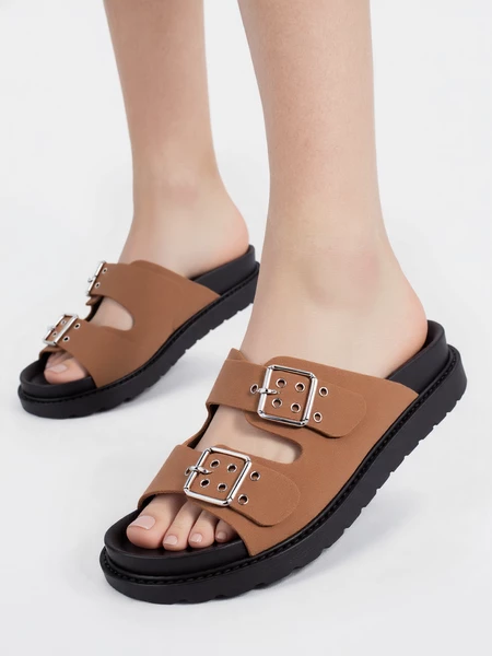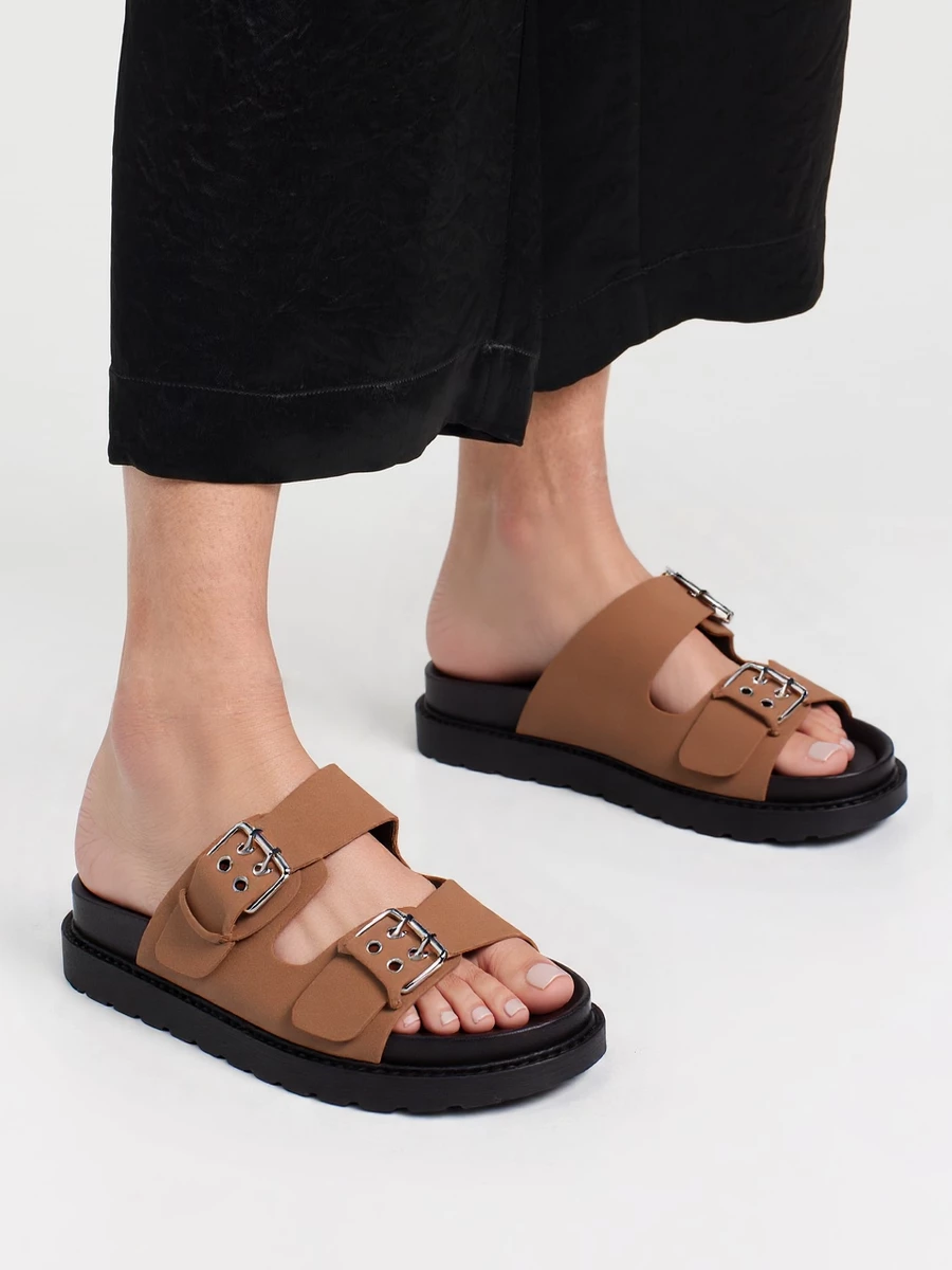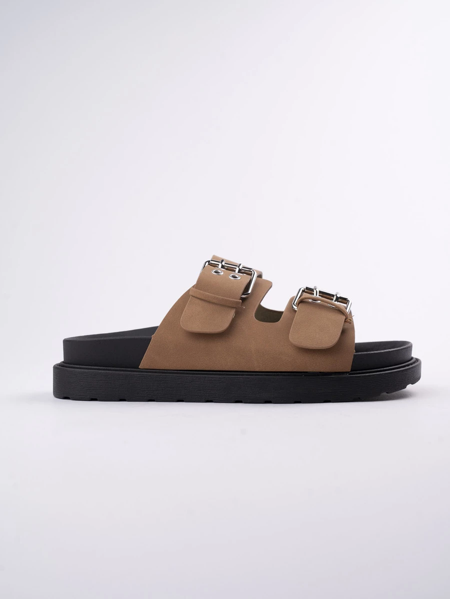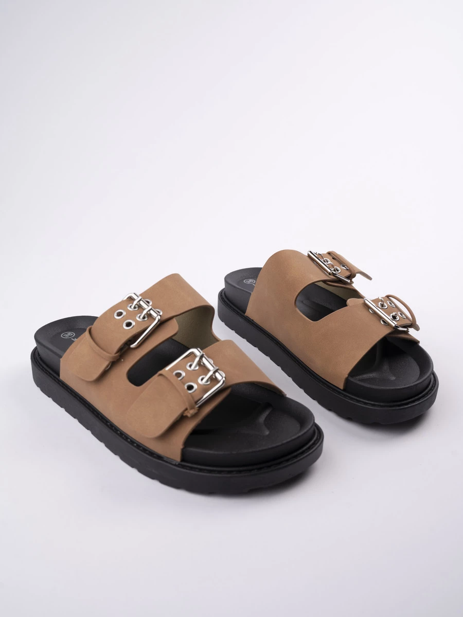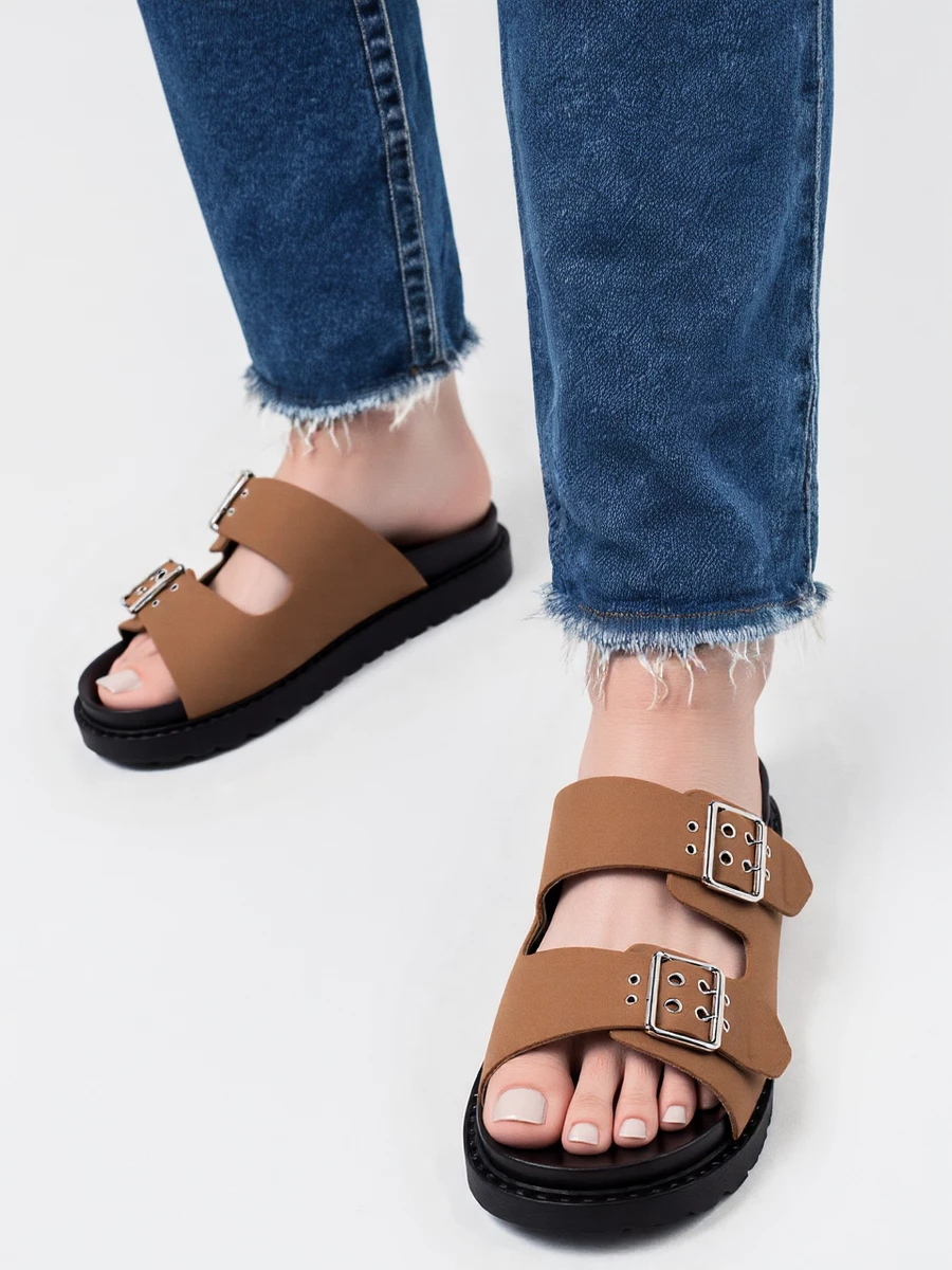 Klapki na koturnie damskie z regulowanymi klamrami w kolorze Camel