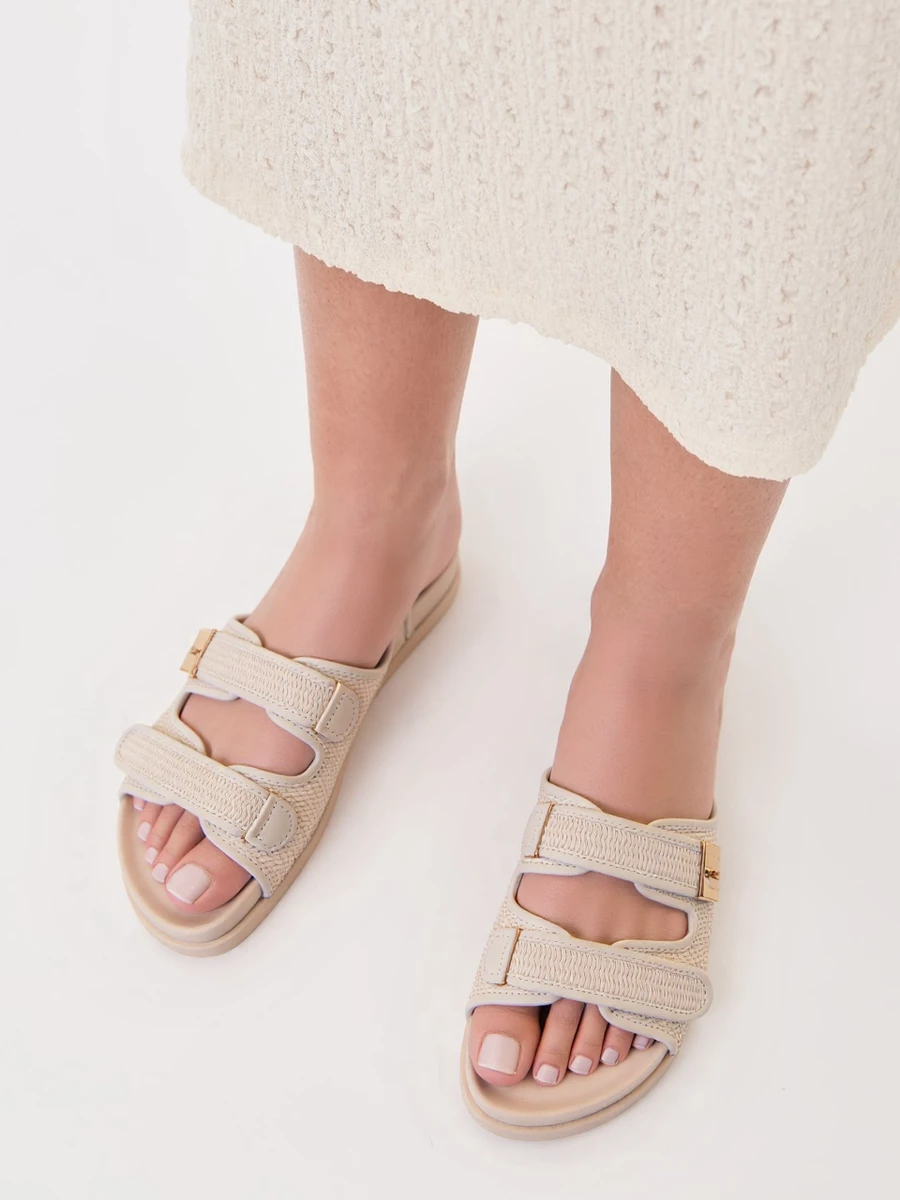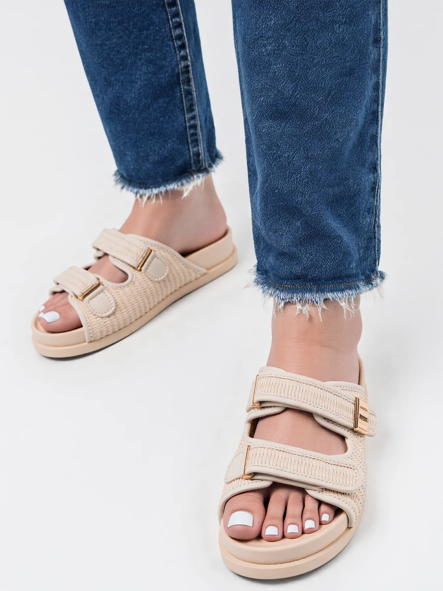 Klapki damskie w kolorze Beige to doskonały wybór na ciepłe dni. Wykonane z wysokiej jakości skóry zapewniają komfort noszenia i trwałość. Klapki charakteryzują się trzema regulowanymi rzepami, które umożliwiają idealne dopasowanie do stopy. Dodatkowo, płaska podeszwa zapewnia wygodę przez cały dzień. Dzięki swojej eleganckiej prostocie i uniwersalnemu beżowemu kolorowi, łatwo je zestawić z różnorodnymi stylizacjami letnimi. Te klapki to idealny wybór dla kobiet ceniących sobie zarówno komfort, jak i styl.
