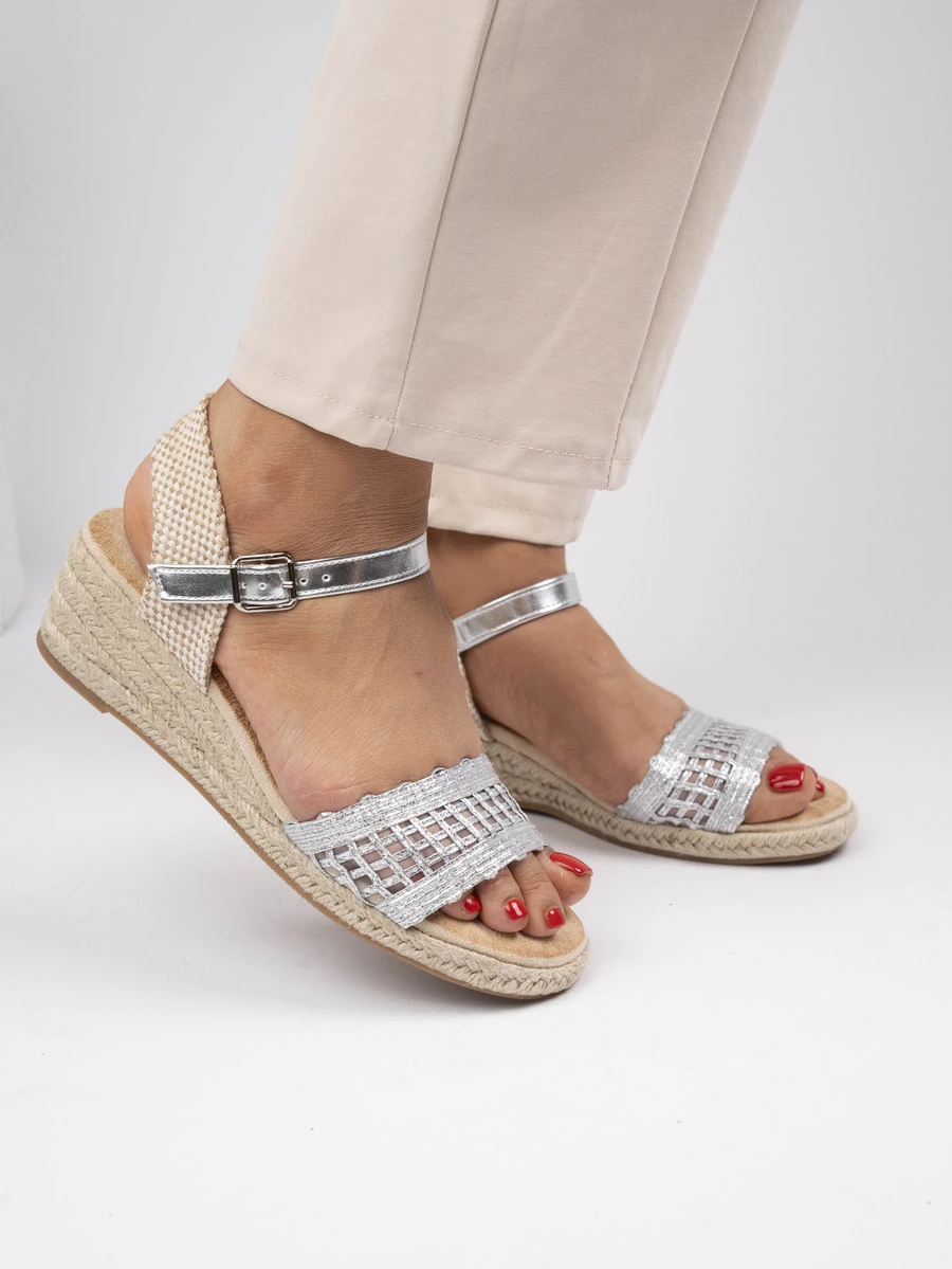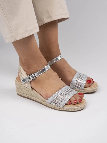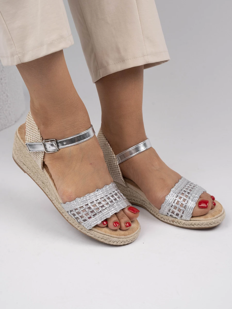Sandały na koturnie z ażurowym wzorem i plecioną podeszwą Silver