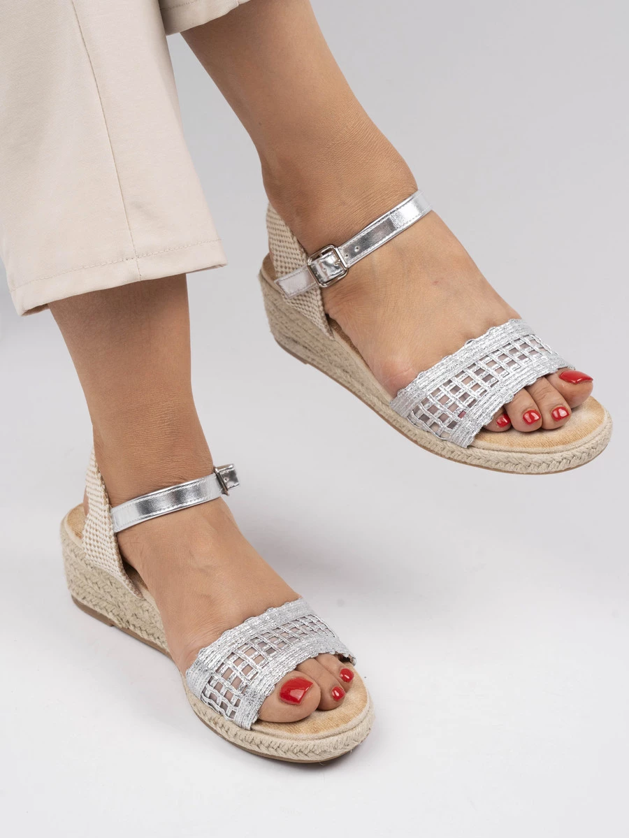 Stylowe sandały na koturnie, które idealnie dopełnią letnią garderobę. Wykonane z dbałością o szczegóły, posiadają srebrny pasek zapinany na kostkę, co zapewnia wygodę noszenia i stabilność. Ażurowy design dodaje elegancji i przewiewności, idealnie sprawdzając się w ciepłe dni. Pleciona podeszwa nadaje im naturalnego charakteru i lekkości, stanowiąc doskonały wybór na codzienne wyjścia i wakacyjne spacery. Te sandały w kolorze Silver to idealne połączenie stylu i komfortu.