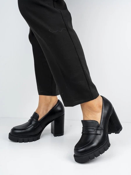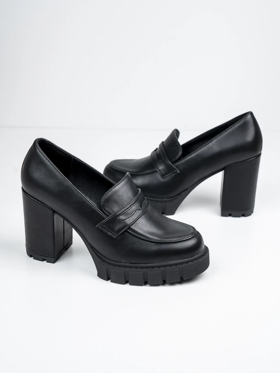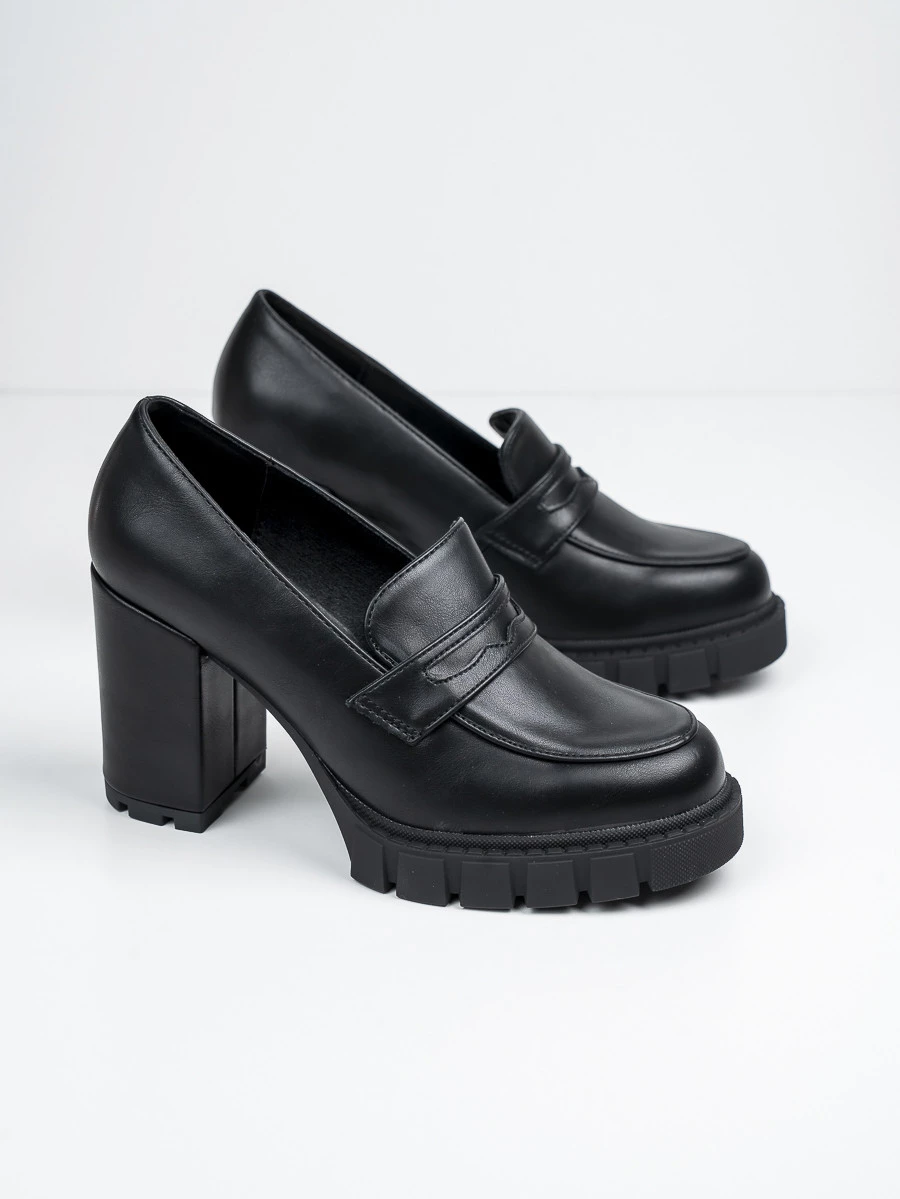 Eleganckie mokasyny damskie na obcasie, w stylu nowoczesnym, wykonane z materiału BlackPU. Idealne do codziennych stylizacji, zapewniają wygodę i elegancję dzięki grubej podeszwie i stabilnemu obcasowi.