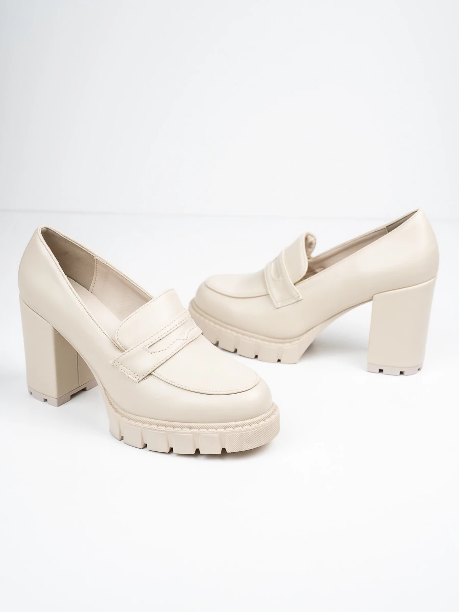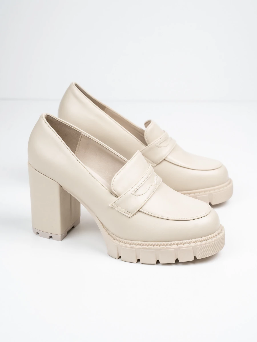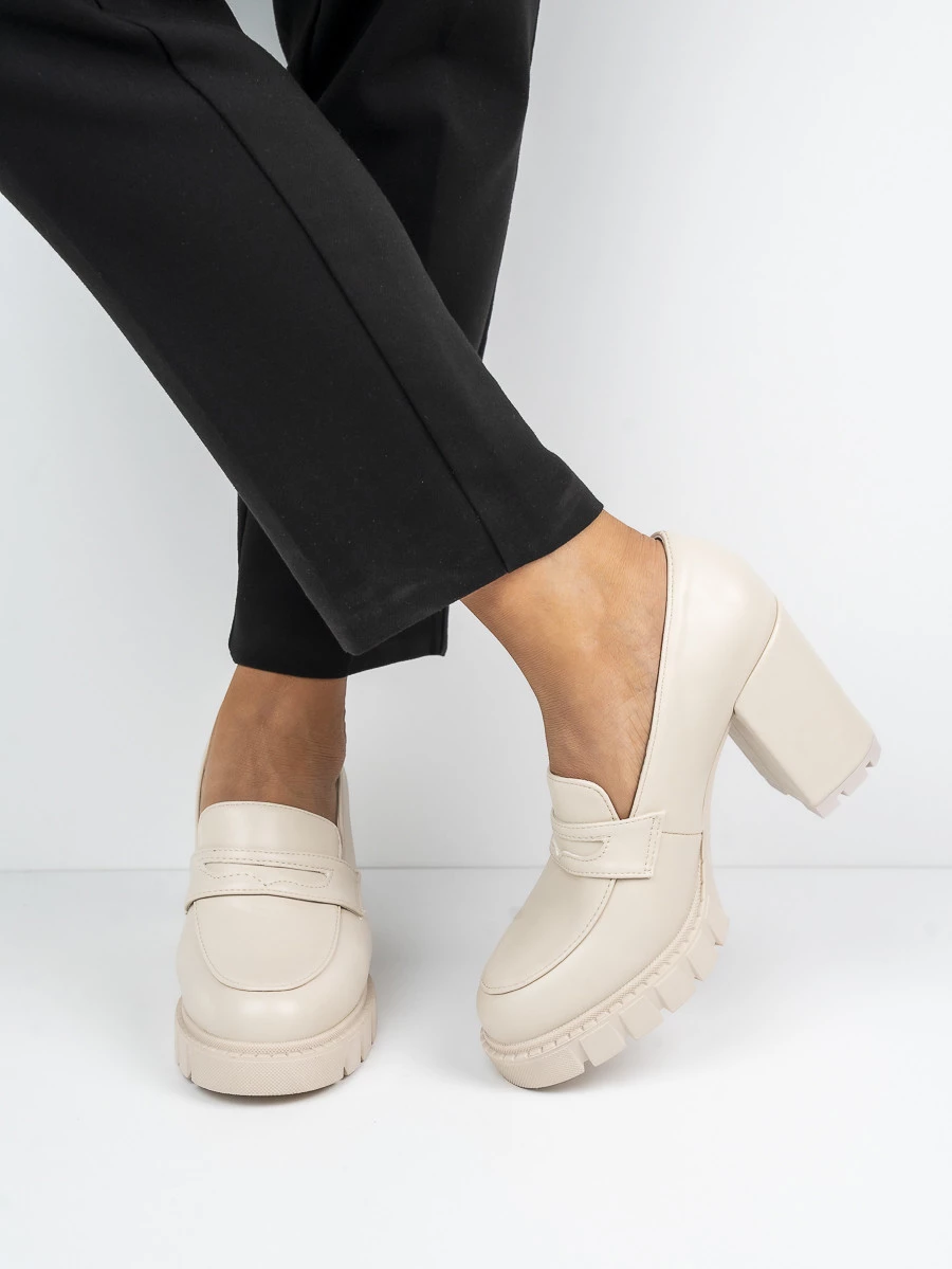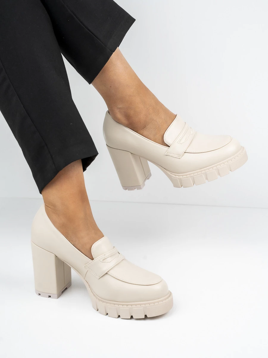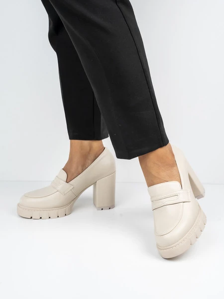 Eleganckie mokasyny na obcasie z masywną podeszwą to połączenie stylu i komfortu. Idealne do formalnych i codziennych stylizacji, w pięknym kolorze Beige, dodadzą charakteru każdej garderobie.