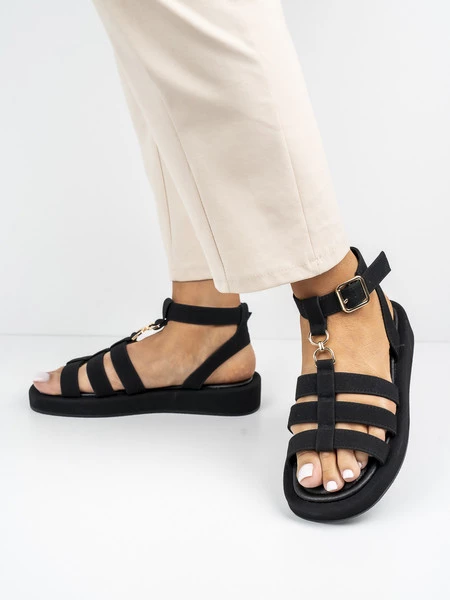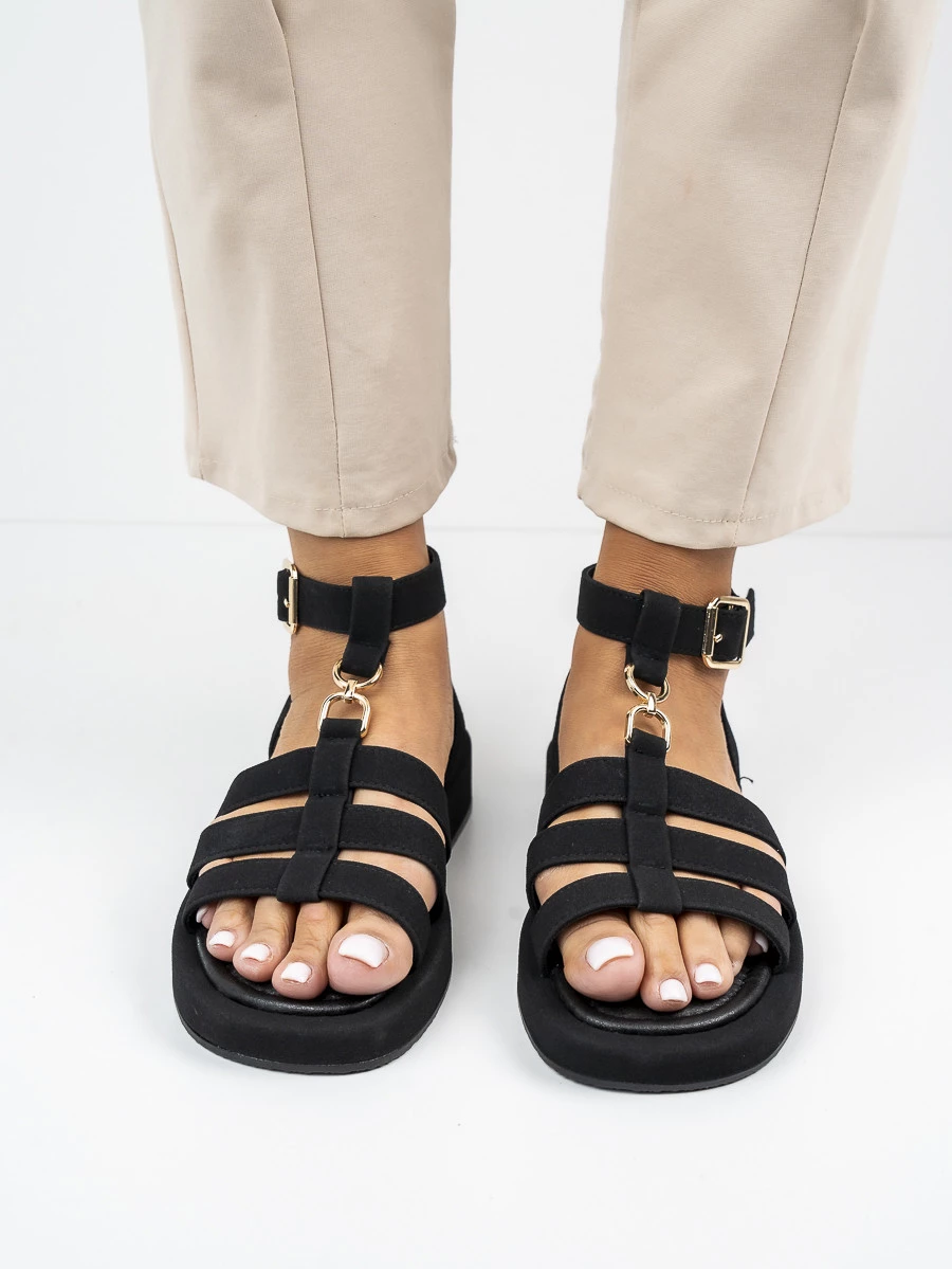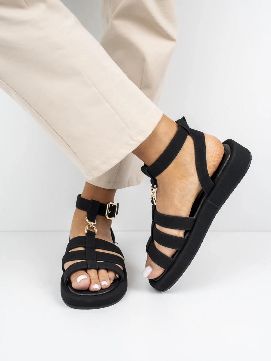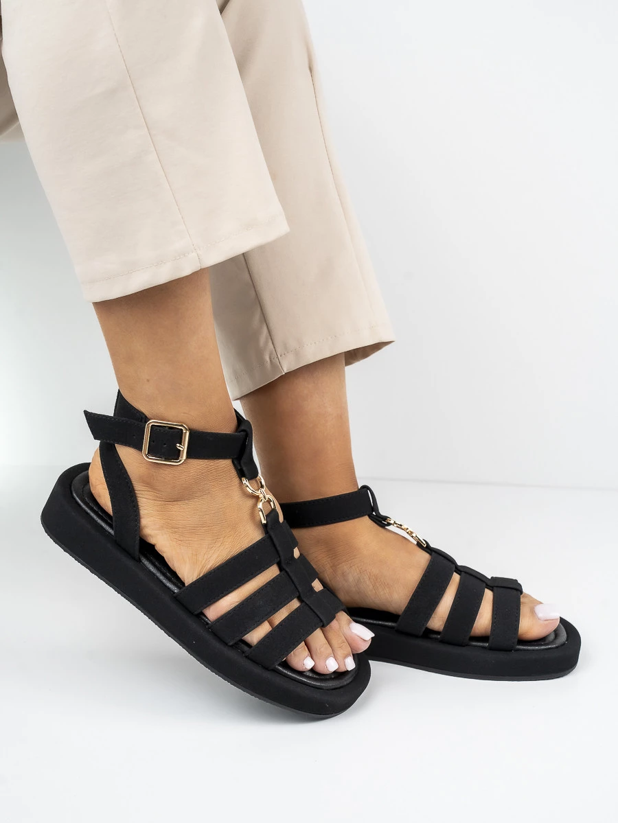 Stylowe sandały płaskie damskie z klamrą, idealne na letnie dni. Wyróżniają się eleganckim designem i komfortowym krojem. Wykonane w kolorze Black, doskonale komponują się z różnymi stylizacjami.