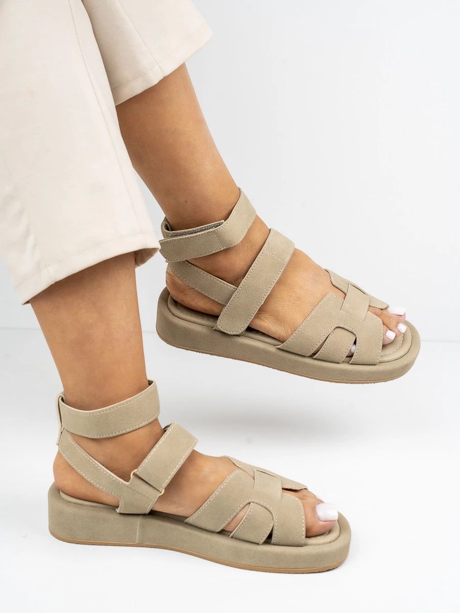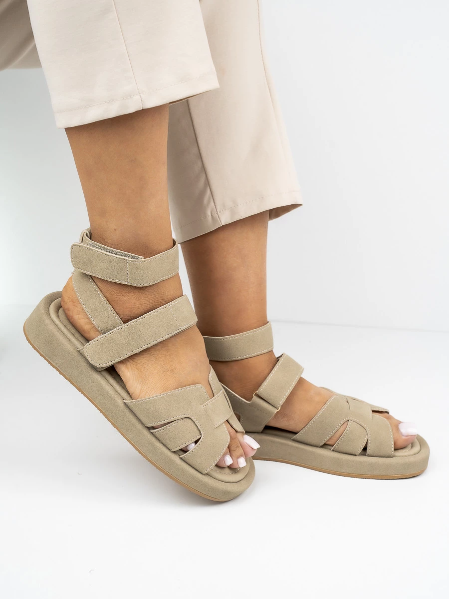 Te stylowe sandały płaskie w kolorze khaki wyposażone są w wygodne zapięcie na rzep, które ułatwia ich zakładanie i zdejmowanie. Idealne na letnie dni, oferują komfort oraz modny wygląd dzięki solidnej konstrukcji i miękkim materiałom. Doskonale pasują do codziennej stylizacji.