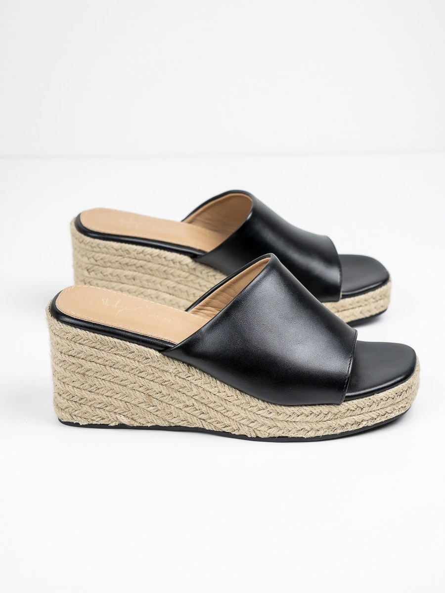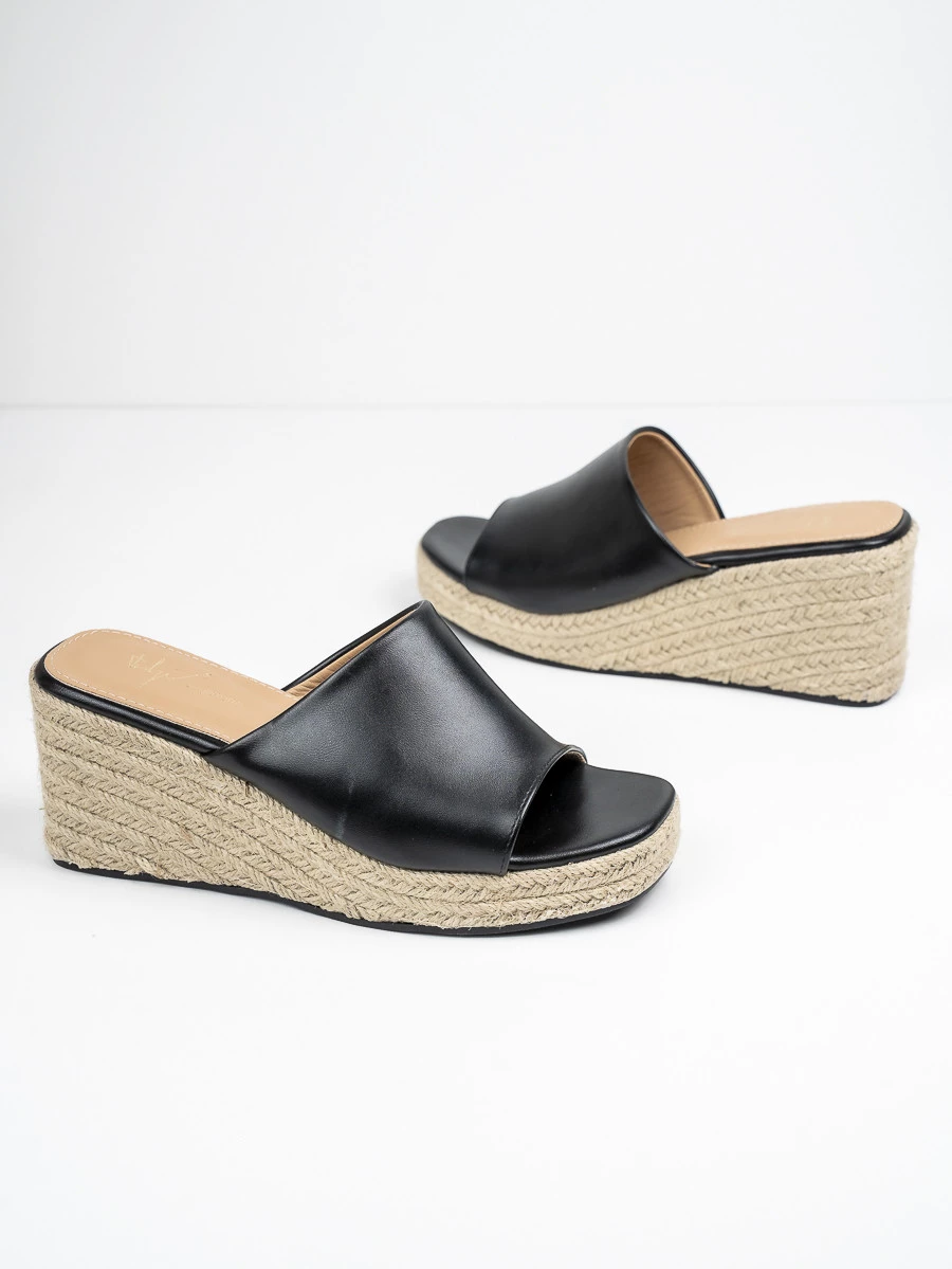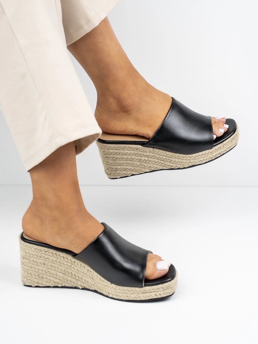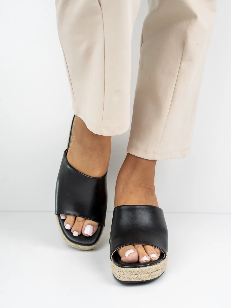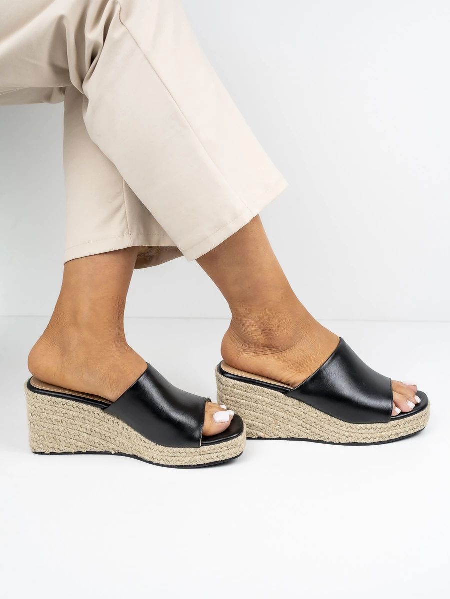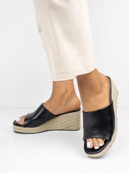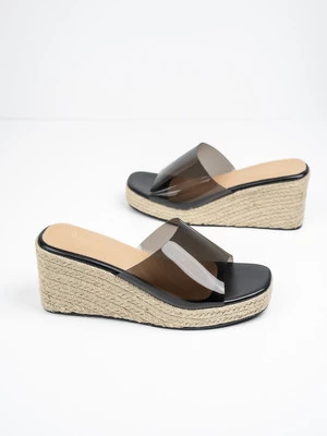 Te modne czarne klapki na koturnie to połączenie wygody i stylu. Szeroki pasek wykonany z gładkiego materiału doskonale dopasowuje się do stopy, a pleciona koturna nadaje lekkiego, naturalnego charakteru. Dzięki stabilnej podeszwie z wysokim obcasem typu koturn, klapki są idealne na letnie dni, zapewniając komfort i swobodę ruchu. Doskonałe do casualowych i eleganckich stylizacji.