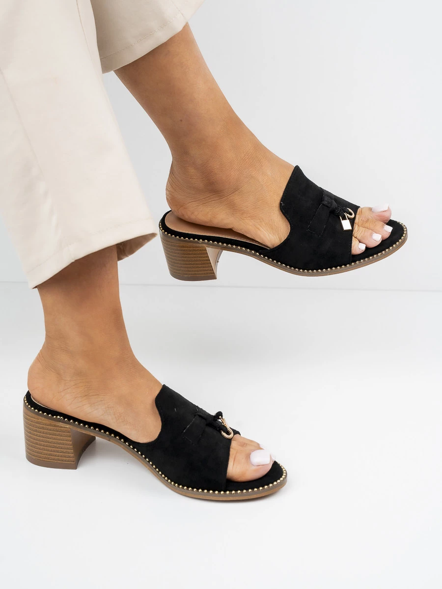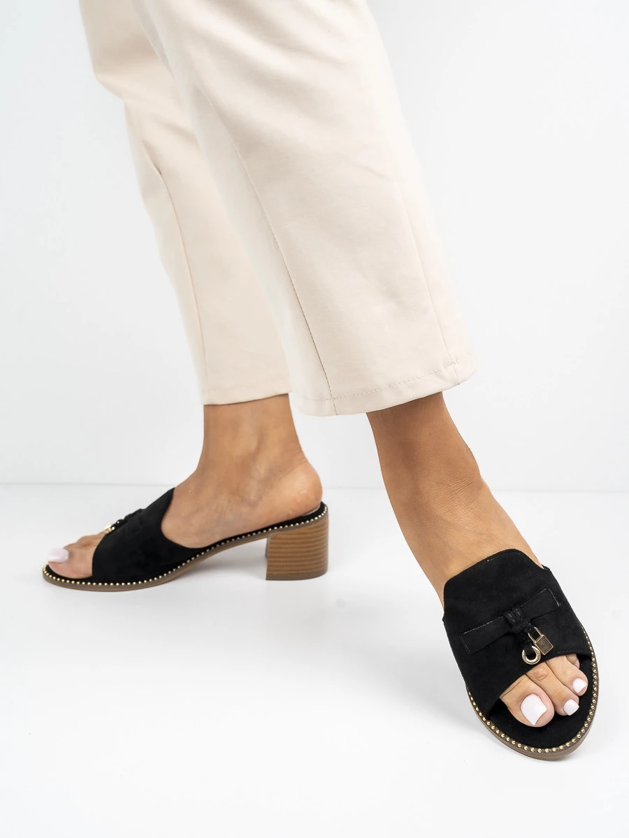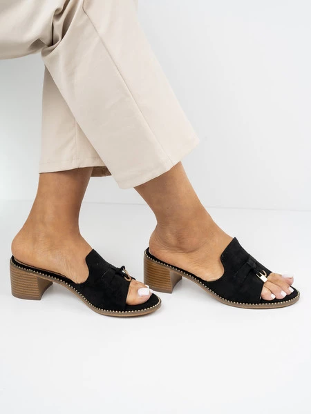 Stylowe klapki na obcasie w kolorze Black z eleganckim ozdobnym zapięciem. Idealne do codziennych stylizacji, zapewniają wygodę i szyk. Obcas dodaje wysokości, a miękki materiał gwarantuje komfort noszenia.