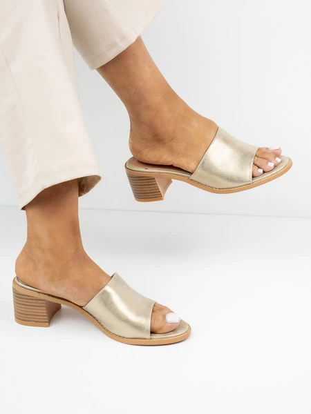 Stylowe klapki na obcasie wykonane ze skóry w eleganckim kolorze Gold. Idealne na letnie dni, łączą komfort z modnym wyglądem, dzięki stabilnemu obcasowi i minimalistycznemu designowi.