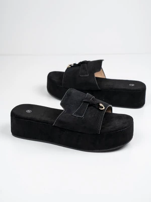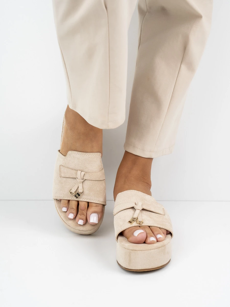 Klapki na koturnie w kolorze Beige to idealny wybór na letnie dni. Wykonane z wysokiej jakości materiałów, zapewniają komfort dzięki miękkiej wkładce. Ozdobne detale dodają elegancji, a neutralny beżowy kolor doskonale uzupełnia każdą stylizację.
