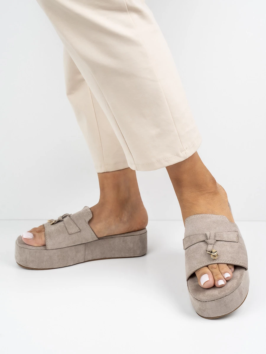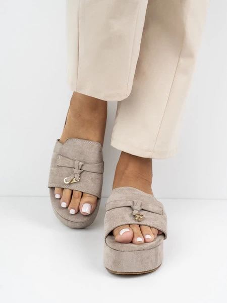 Stylowe klapki na koturnie w kolorze Khaki, które łączą elegancję z wygodą. Wyposażone w subtelne zdobienie na pasku, dodają uroku codziennym stylizacjom. Idealne na ciepłe dni, zapewniają komfort noszenia przez cały dzień.